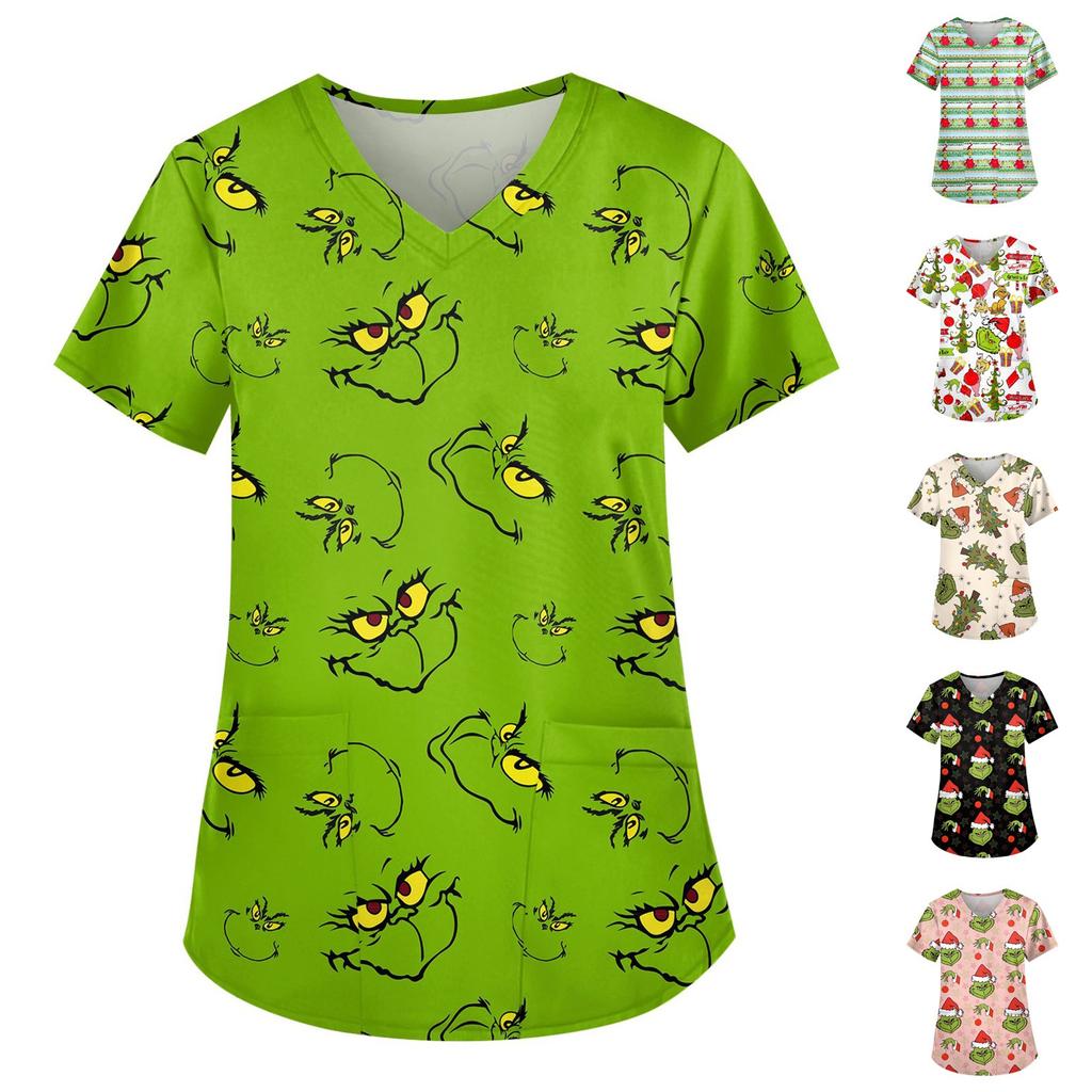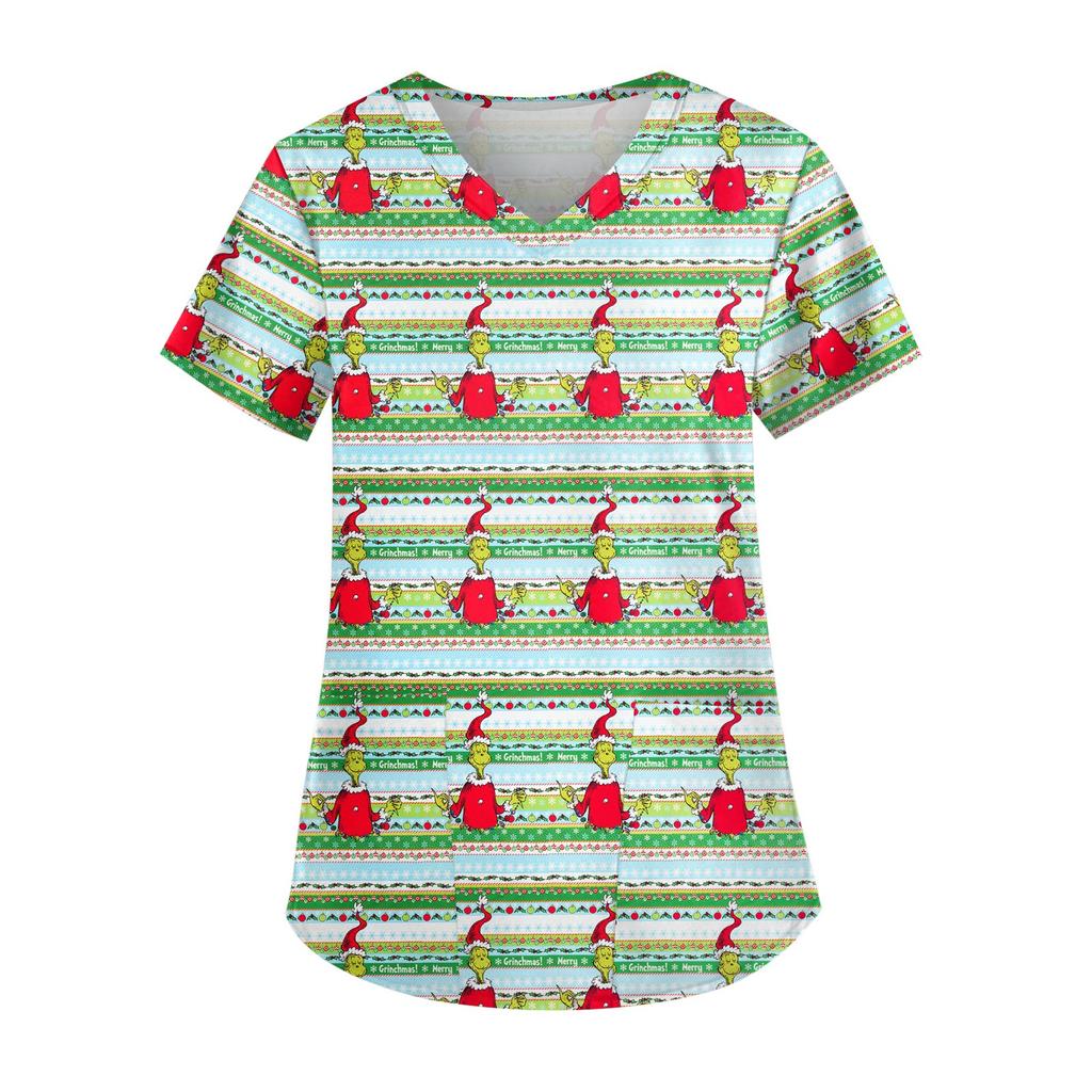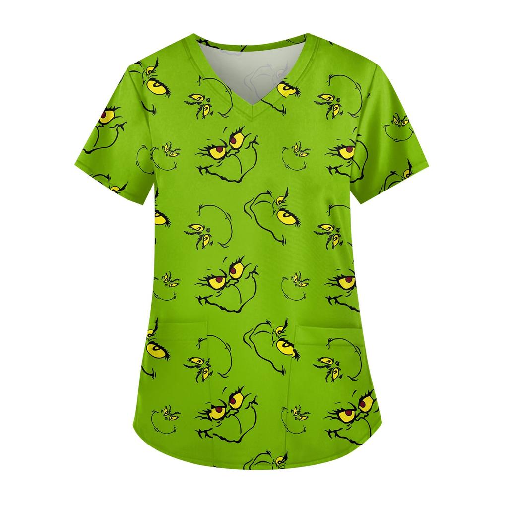 Женская симпатичная рабочая одежда с принтом, V-образным вырезом, двухслойными карманами, базовым коротким рукавом, пуловером на Рождество