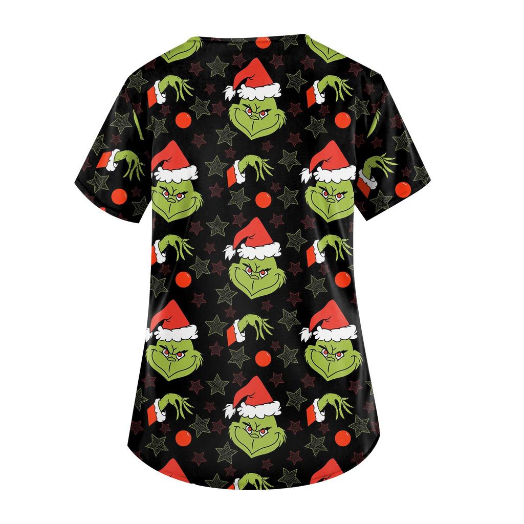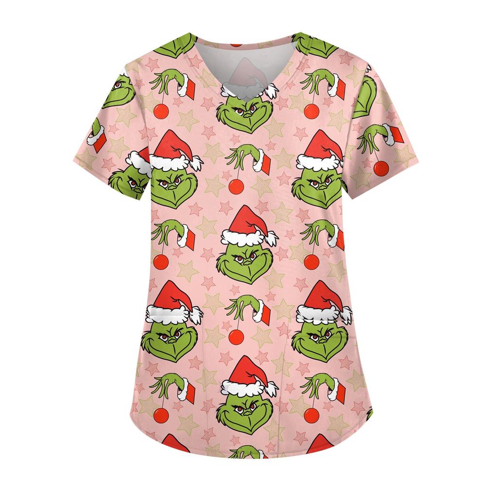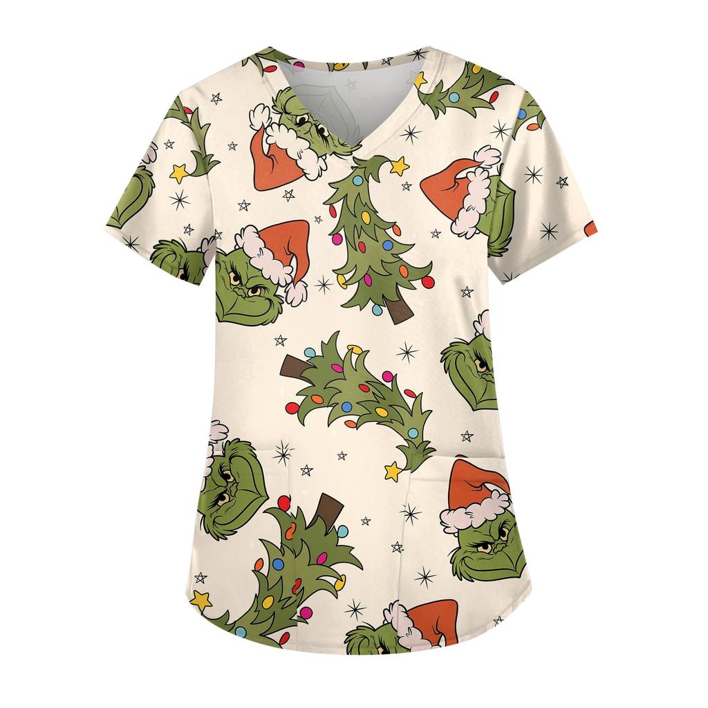 Женская симпатичная рабочая одежда с принтом, V-образным вырезом, двухслойными карманами, базовым коротким рукавом, пуловером на Рождество