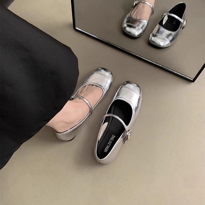 Туфли Мэри Джейн на плоской подошве с квадратным носком, универсальные серебристые, женские, новая летняя коллекция 2025, французские, под юбку, маленькие кожаные туфли