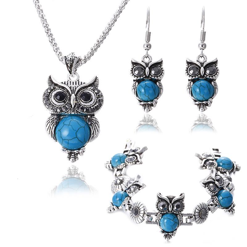 Металлический набор украшений с совой и бирюзой: Ожерелье, Серьги и Браслет - Европейская и Американская Мода — купить товар онлайн с бесплатной доставкой по всему миру!