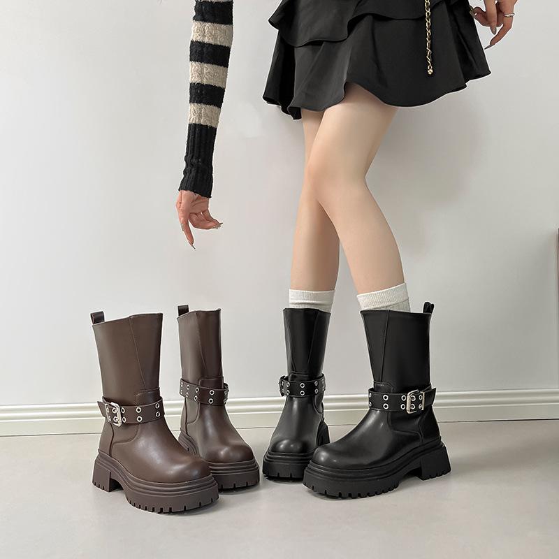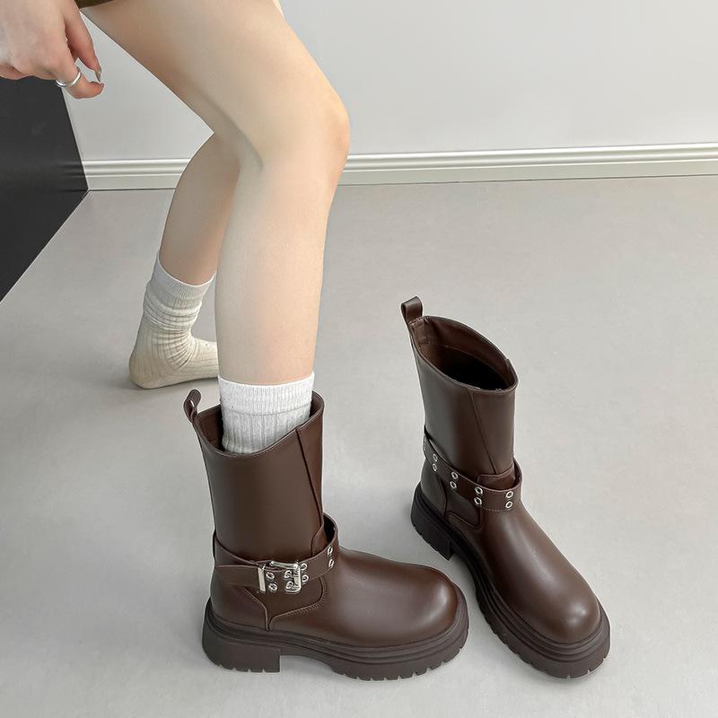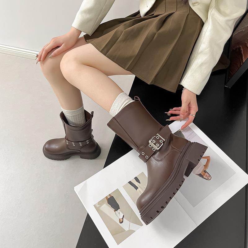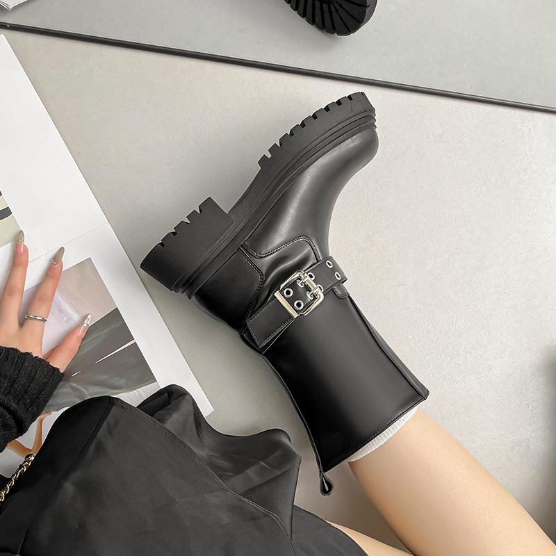 Осень и зима новые полусапоги 2025 новые на толстой подошве толстый каблук британский стиль широкое голенище пряжка-ремень ботинки мартин короткие ботинки женские