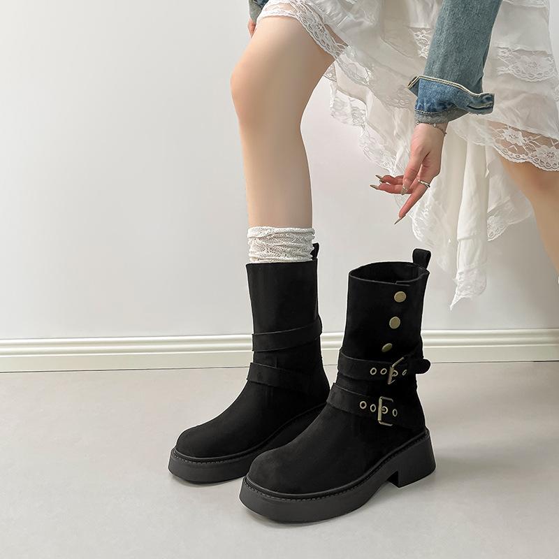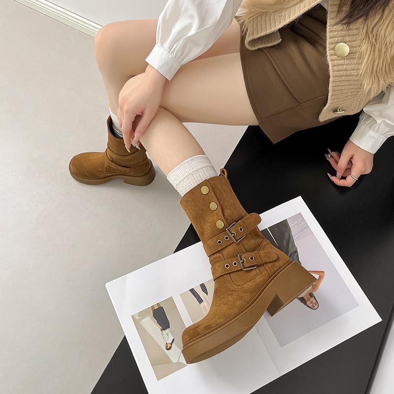 Thick-soled British Martin Boots Women's 2025 Autumn and Winter Skinny Pile Boots Short Boots Brown Frosted Coarse Heel Knight Boots
