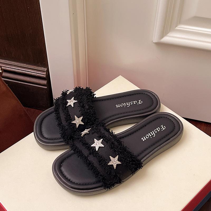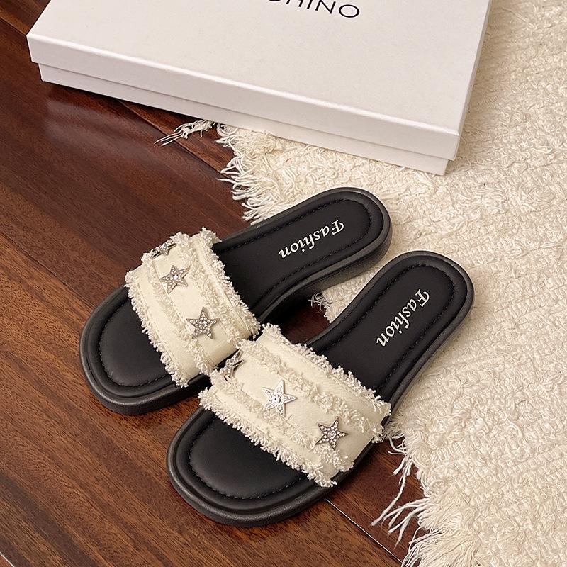 Французские тапочки в стиле «маленькая Шанель» женские летние 2025 новинка модные сандалии для пляжа на плоской подошве со стразами