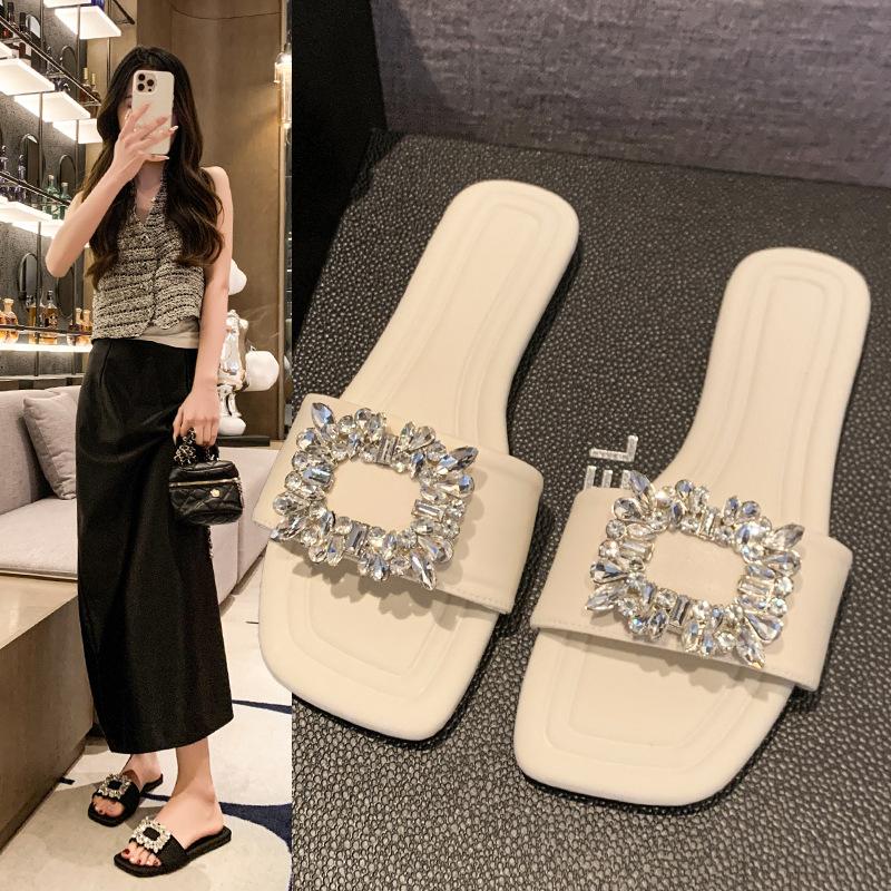 Xiaoxiangfeng носит шлепанцы на плоской подошве для женского лета, новые шлепанцы с квадратной пряжкой из стразов, интернет-знаменитость, шлепанцы в стиле ins tide