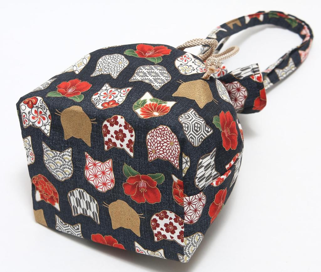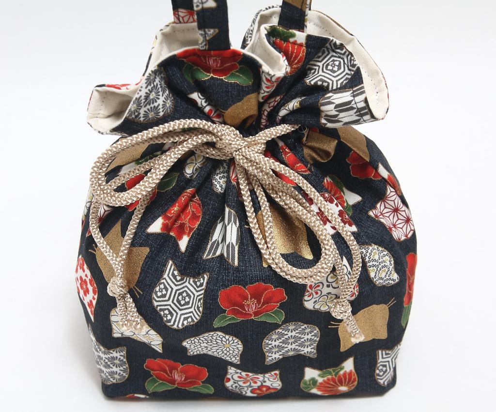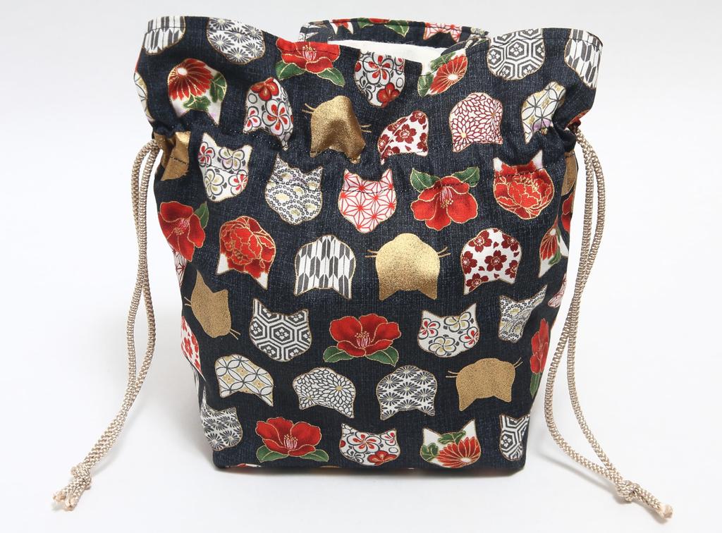 Hasegawa Cat Print Drawstring Bag with Made in Japan Handle, (Cat Silhouette/Black)
