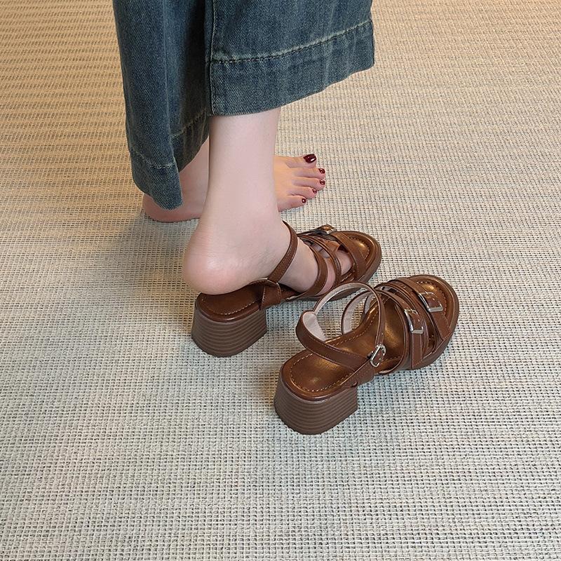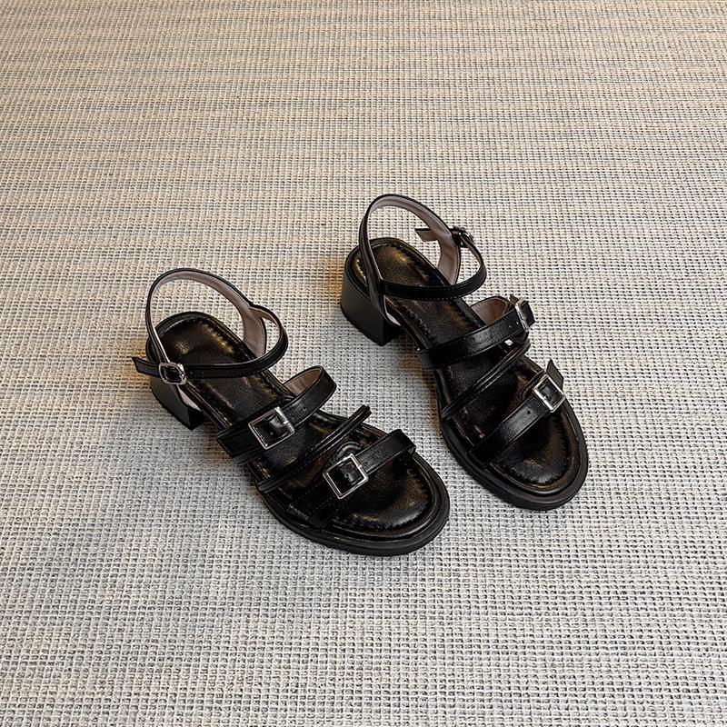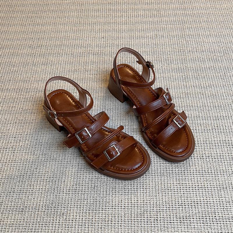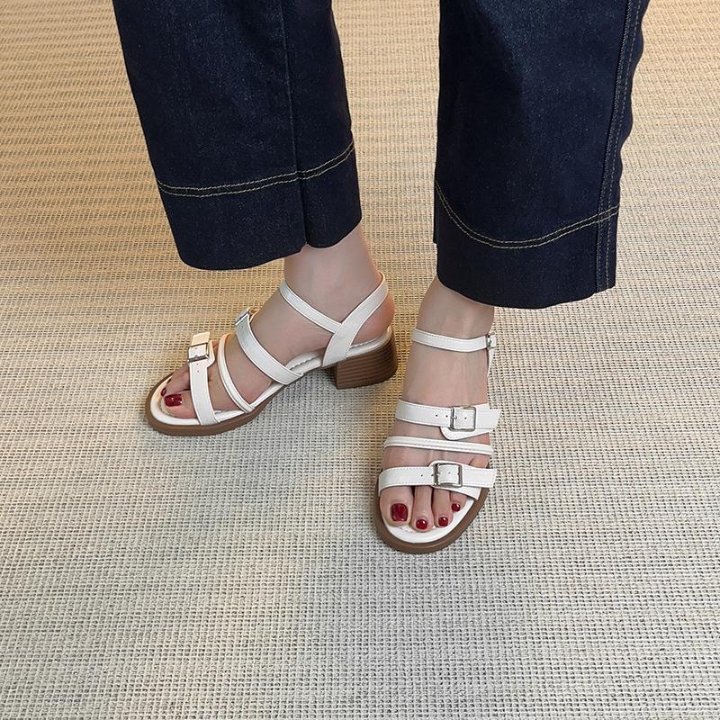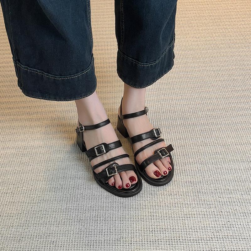 Holiday wind summer fashion outer wear open-toed sandals thick heel belt buckle stepping on shit feeling retro middle heel Roman sandals women