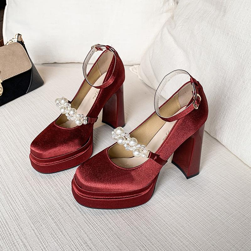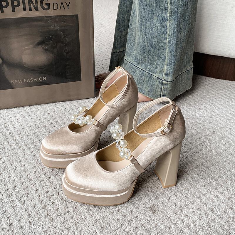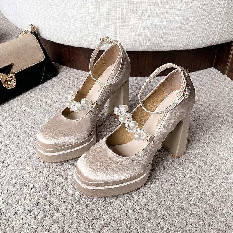 French high heels square head one-word buckle fashion shoes thick heel spring and autumn new single shoes 11cm 2025 waterproof tai xian