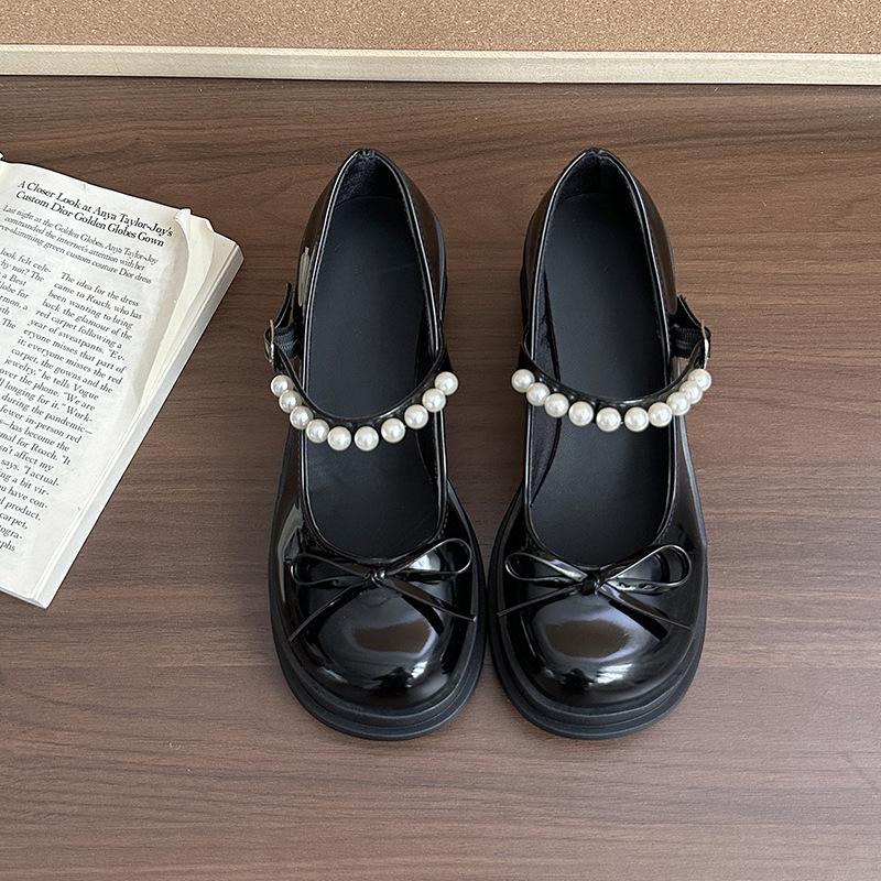 Туфли Мэри Джейн Женские 2025 Осень Новая Мода Одинарные Туфли Милый Бант Толстый Каблук Жемчуг Маленькие Кожаные Туфли
