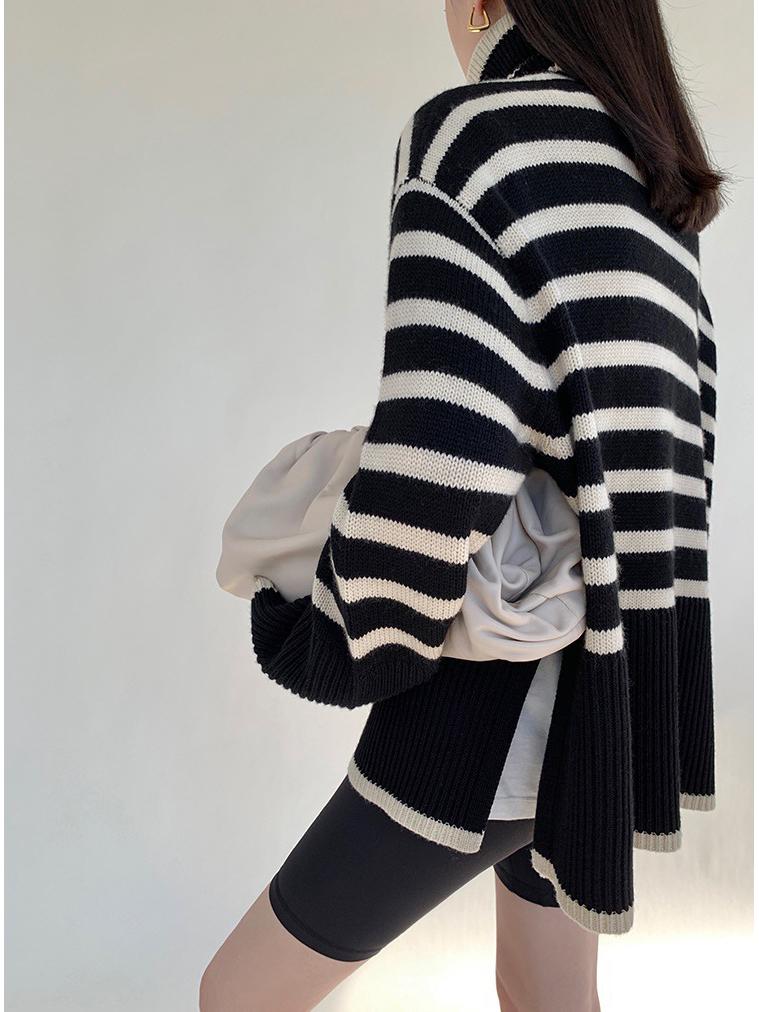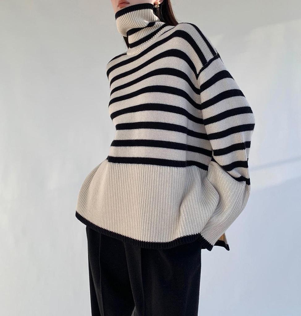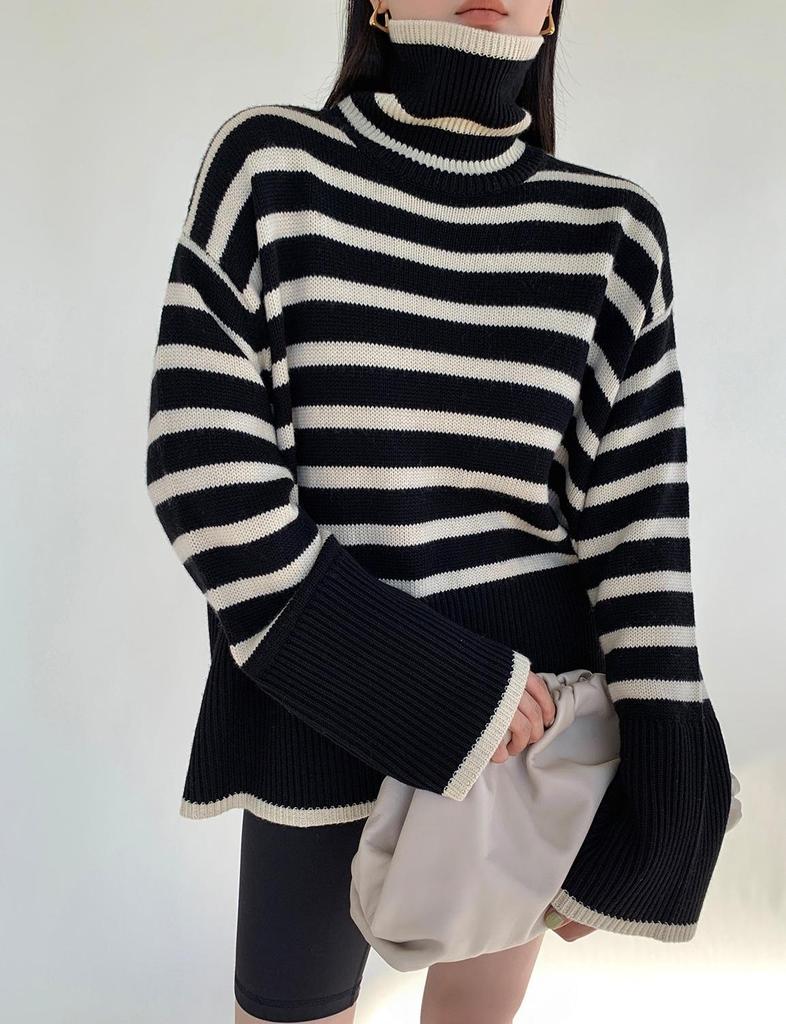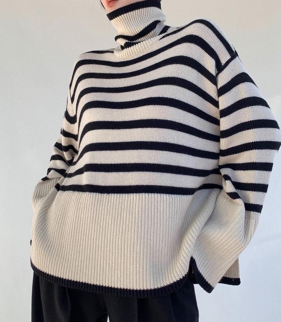 Женский вязаный свитер с высоким воротником - Ретро полосатый дизайн, свободный крой, осень/зима 2023, корейский стиль.