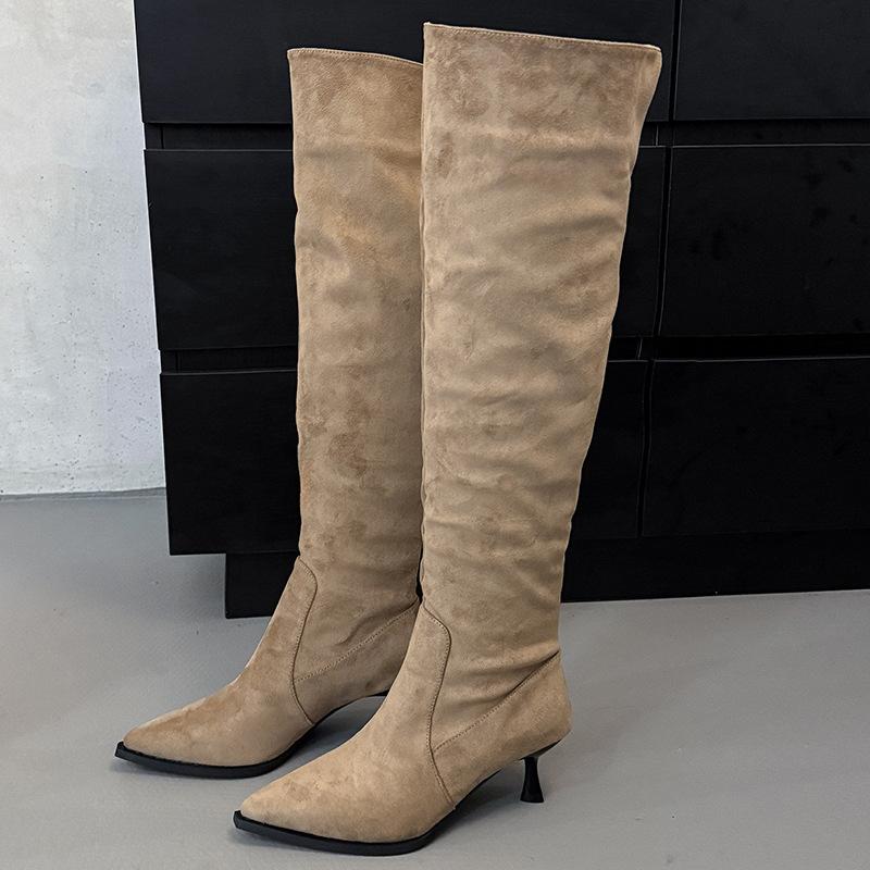 Ботфорты для женщин, большой обхват голенища, 2025 осень-зима, новая замшевая модель с острым носком, тонким высоким каблуком, плиссированные ботинки-чулки