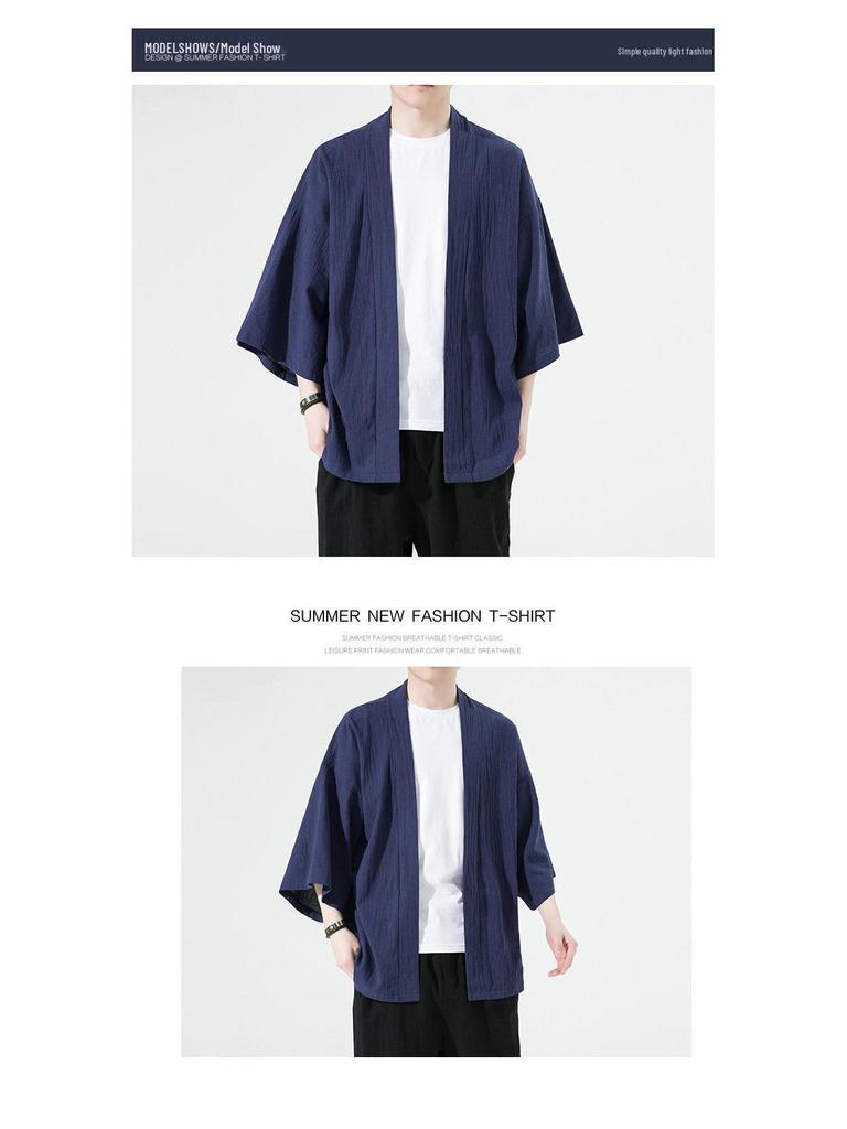 Откройте для себя воплощение повседневной элегантности с этим мужским кардиганом свободного кроя однотонной расцветки с рукавами семь восьмых.. Идеальный для лета, этот кардиган отличается уникальным сочетанием конопли и льна, обеспечивающим как комфорт, так и воздухопроницаемость.. Его дизайн включает стильную стойку воротник и однотонный узор, воплощая современный взгляд на классический китайский стиль.. Доступный в больших размерах, он органично сочетает традиции с современной модой, что делает его идеальным выбором для расслабленного, но изысканного образа.