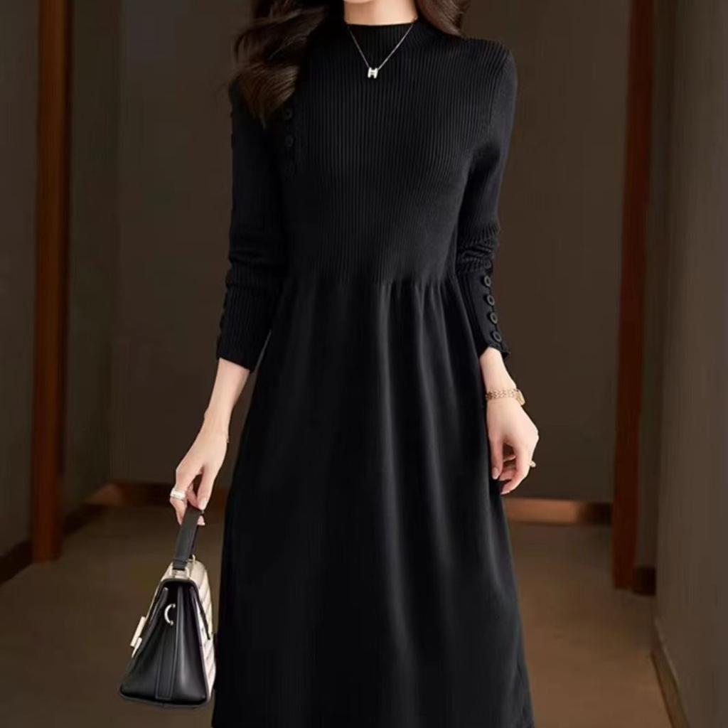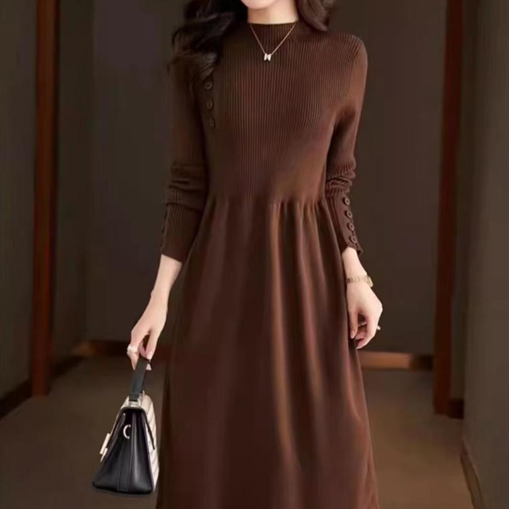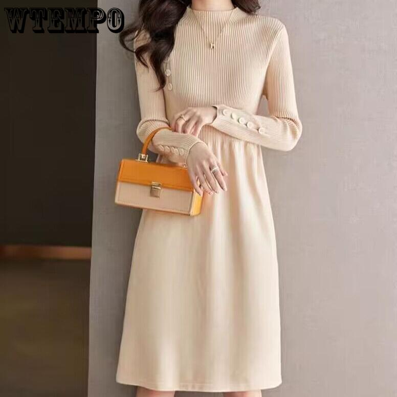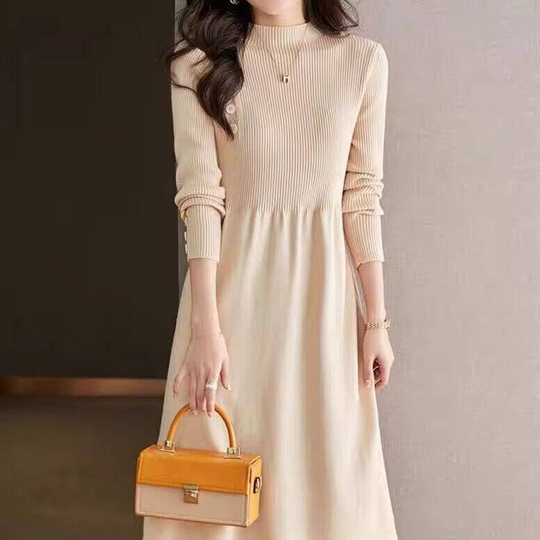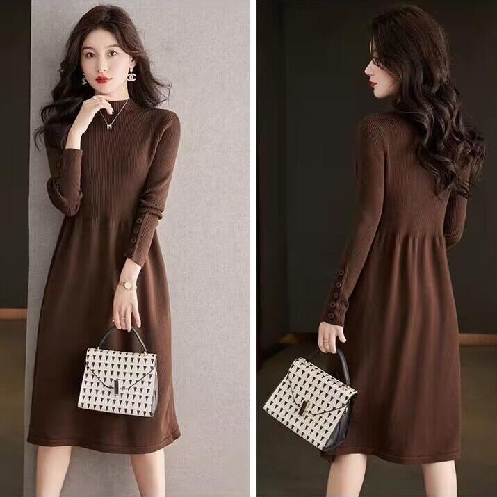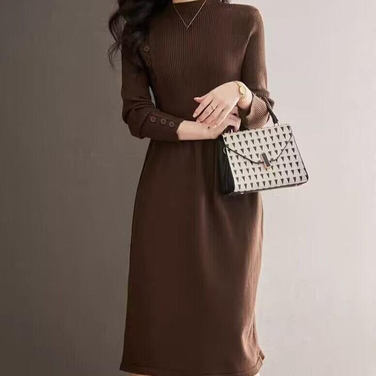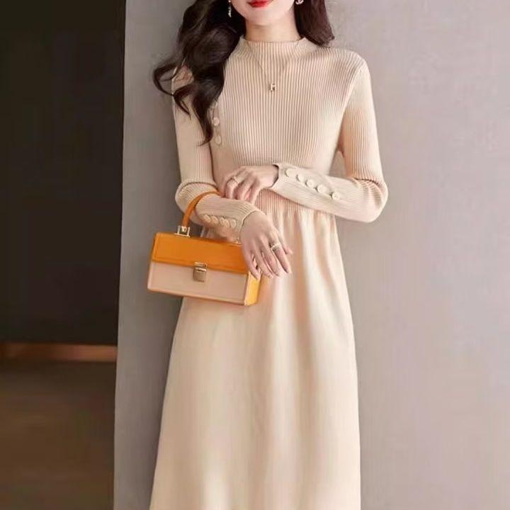 Вязаное платье с полувысоким воротником для женщин, однотонное, повседневное, длиной до колена, платье-свитер, вязаный свитер средней длины для осени и зимы