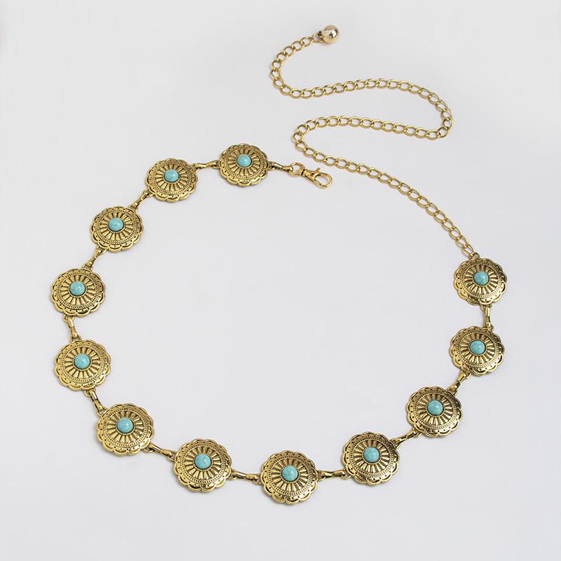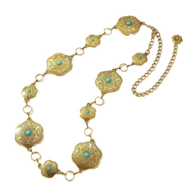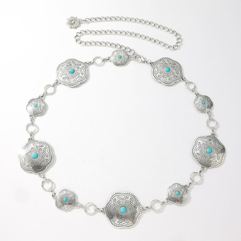 Бирюзовая металлическая цепочка на талию в западном стиле серебристого цвета с резными деталями для женщин
