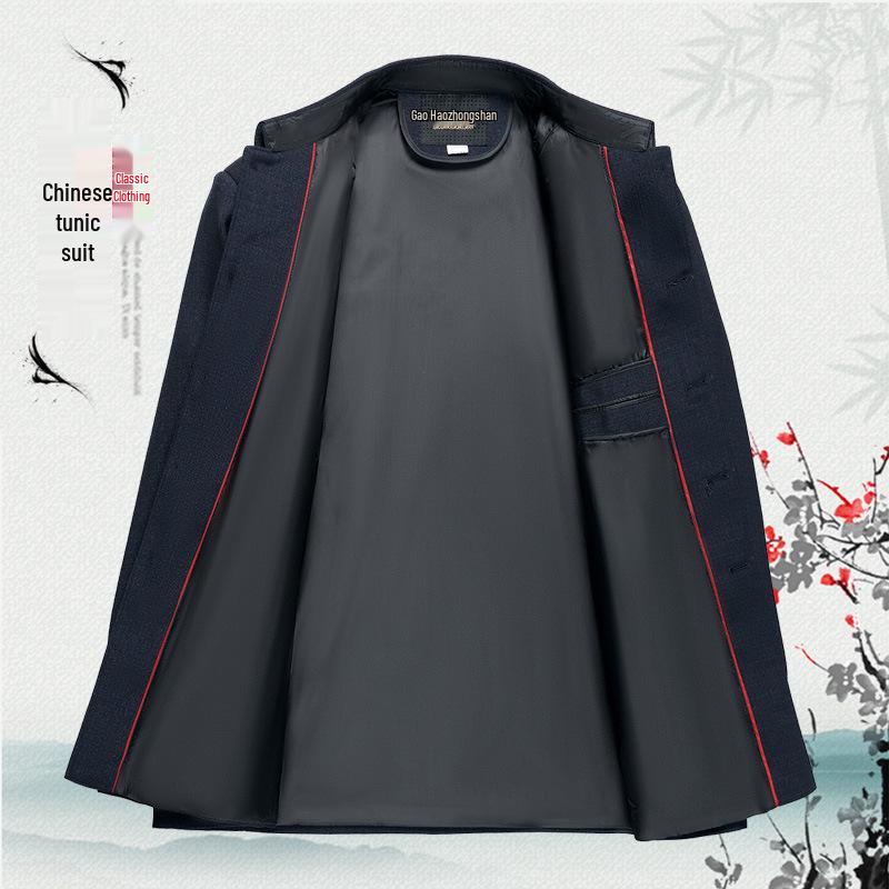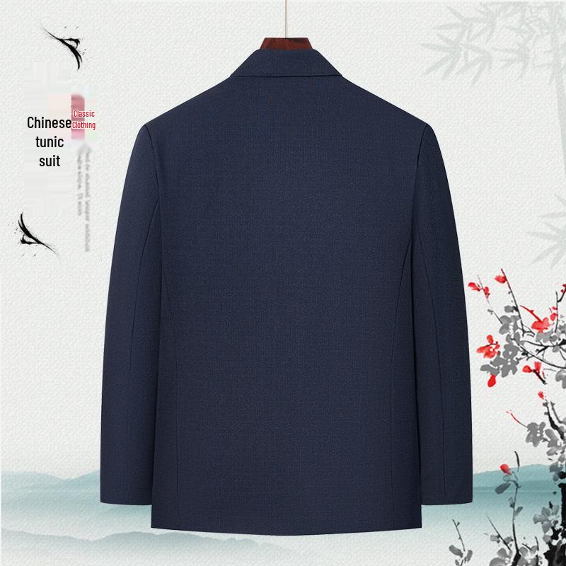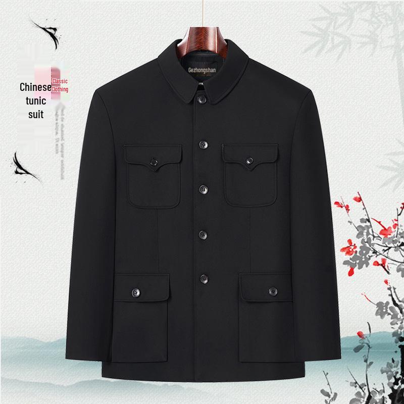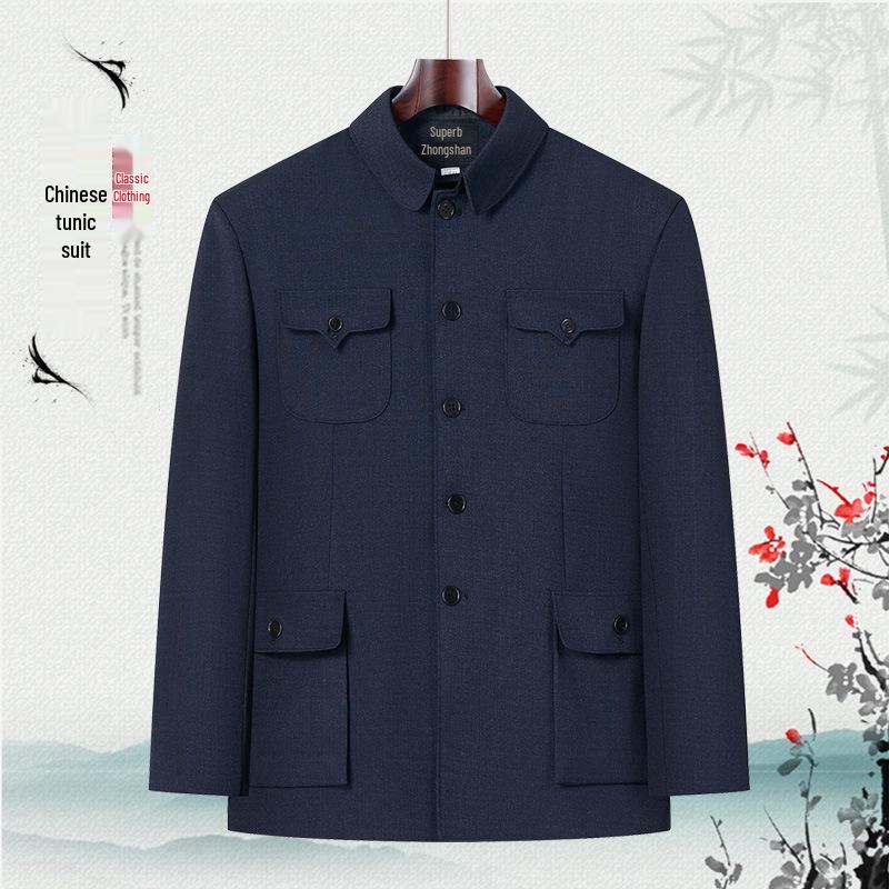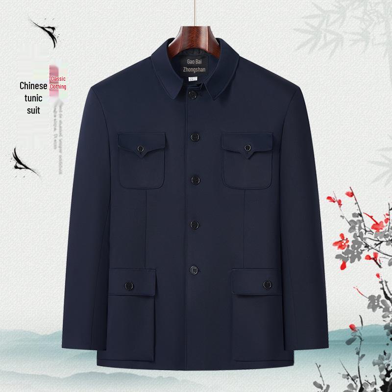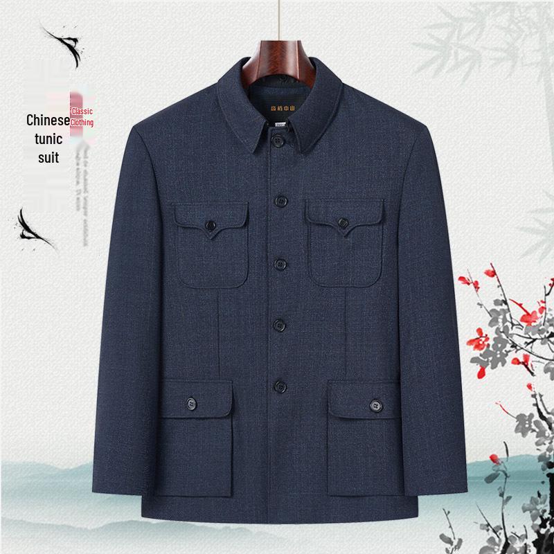 Этот мужской костюм Чжуншань специально разработан для людей среднего и пожилого возраста, предлагая сочетание традиционного стиля и современного комфорта.. Идеальный для осени и зимы, этот комплект служит отличным выбором верхней одежды, также называемым костюмом Тан для дедушек.. Изготовленный из смесового хлопка, костюм сочетает в себе прочность с мягким, уютным ощущением, обеспечивая тепло в прохладные месяцы.. Дизайн сочетает в себе классическую элегантность с практичностью, что делает его вневременным дополнением к любому гардеробу.
