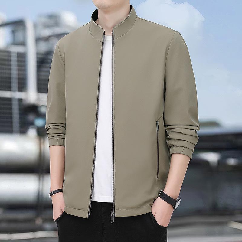 This men's executive jacket is designed for both spring and autumn, offering a seamless blend of business and casual style. Featuring a stand collar for a polished appearance, it boasts a medium thickness ideal for transitional weather. Crafted from durable polyester, it offers long sleeves for full coverage and a streamlined, solid pattern for a sleek look. The jacket incorporates a chemical fiber blended material in its construction, adding to its comfort and wearability. Tailored specifically for men, it's a versatile outerwear choice that harmonizes classic Zhongshan style with modern practicality, making it perfect for dads who appreciate both form and function.