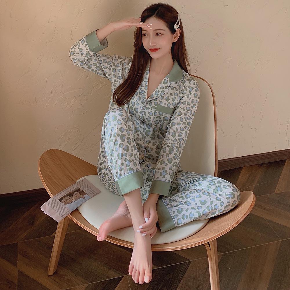 Женский пижамный комплект из шелка с зеленым леопардовым принтом - Длинный рукав и брюки - Легкий сатин для осени и весны — купить товар онлайн с бесплатной доставкой по всему миру!
