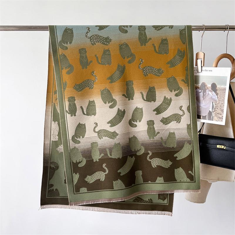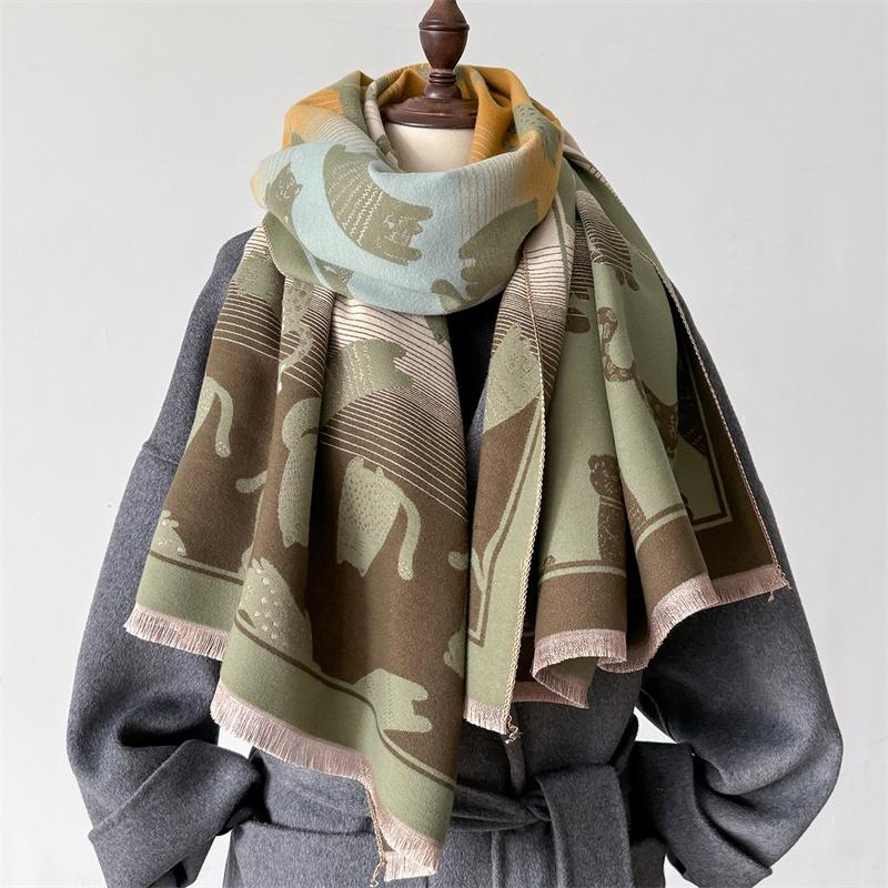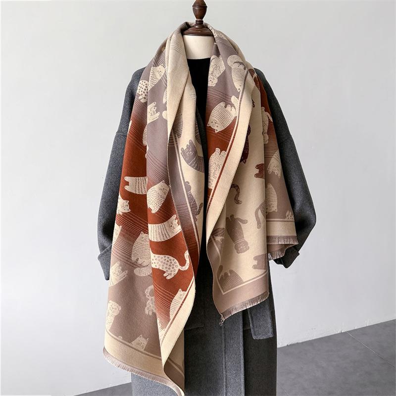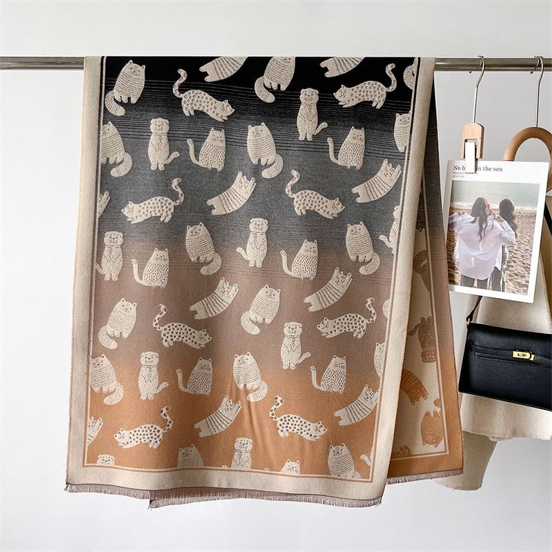 2025 Роскошный женский зимний шарф Имитация кашемира Анималистичный Двусторонний принт кошки Теплая шаль Пашмина Стола Одеяло Фуляр