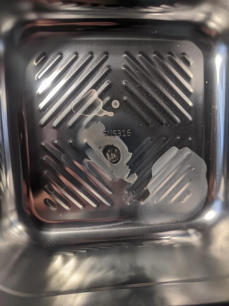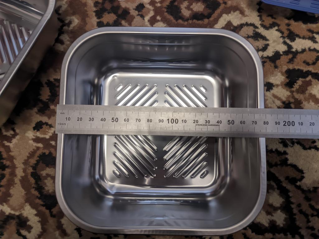 Объём не соответствует описанию, не 1800мл, с горочкой удалось налить 1460 грамм воды, а самый главный недостаток - сталь явно не sus316, она реагирует на кислоты, капал паяльной кислотой, флюсом с содержанием ортофосфорной и уксусом, от них через пару часов появились несмываемые пятна. Так быть не должно, проверял этим способом контейнер из такой стали, купленный в другом месте, никаких пятен не оставалось. Дно и боковушки прогибаются, издавая щелкающие звуки