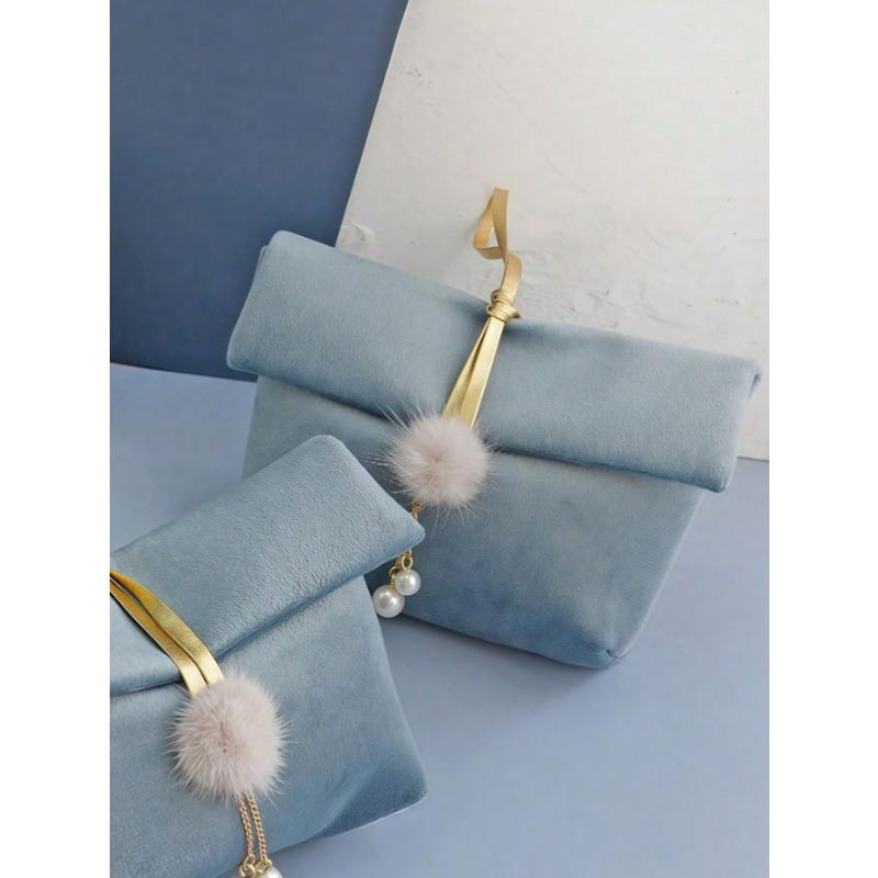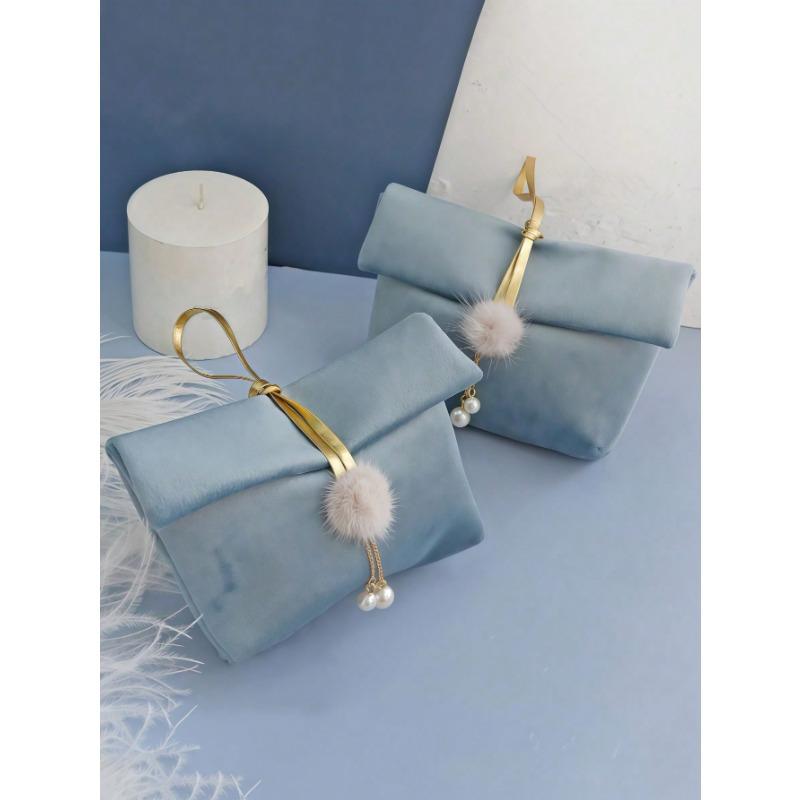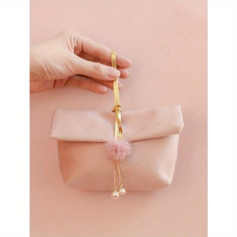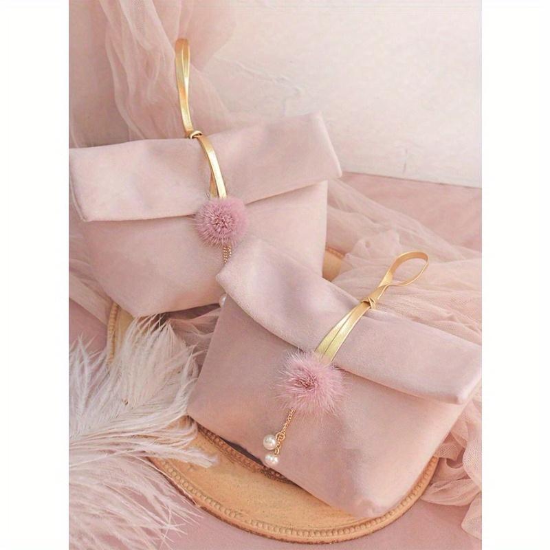 1 шт. 5 см*15,5 см*9,5 см Декоративный подарочный мешочек из полиэстера с искусственным жемчугом и помпоном, Мешочек для хранения ювелирных изделий, Косметичка для путешествий, Розовый мешочек для подарочной упаковки