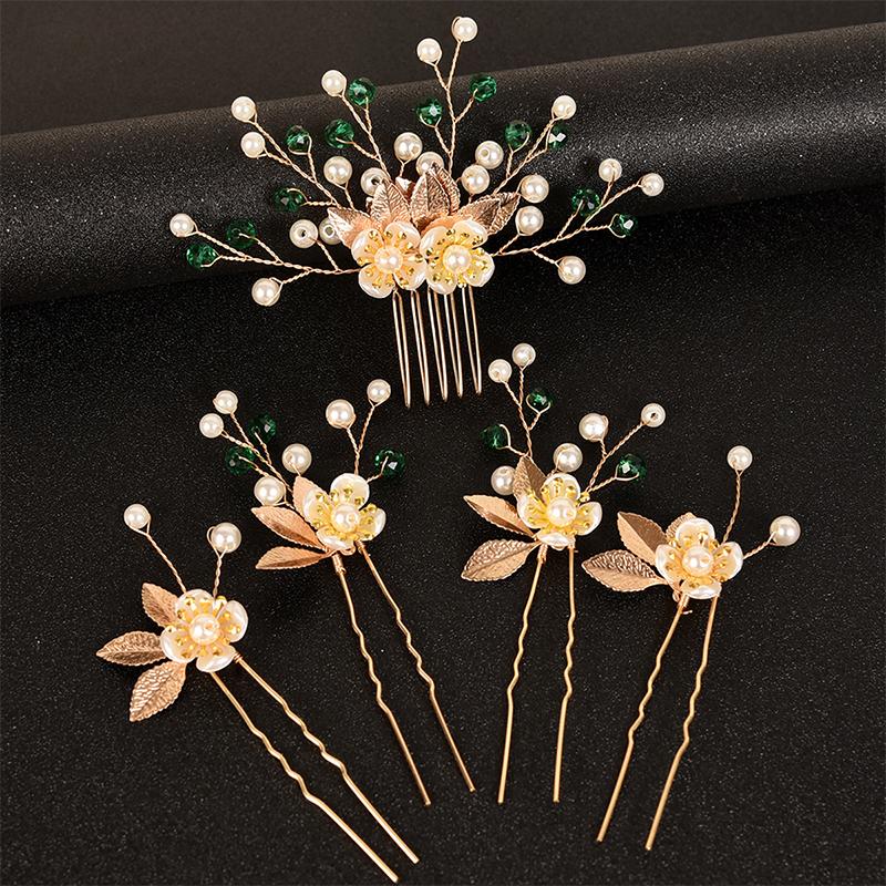 5 шт. Жемчужное цветочное украшение Лист Винтажное золото Ретро Набор из 5 штук Изысканные заколки для волос сказочные Шпильки для волос Элегантные