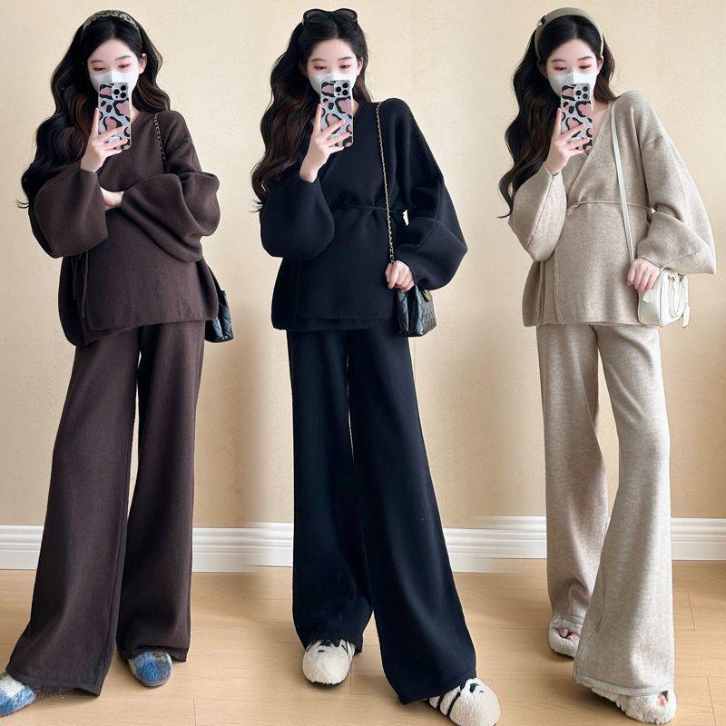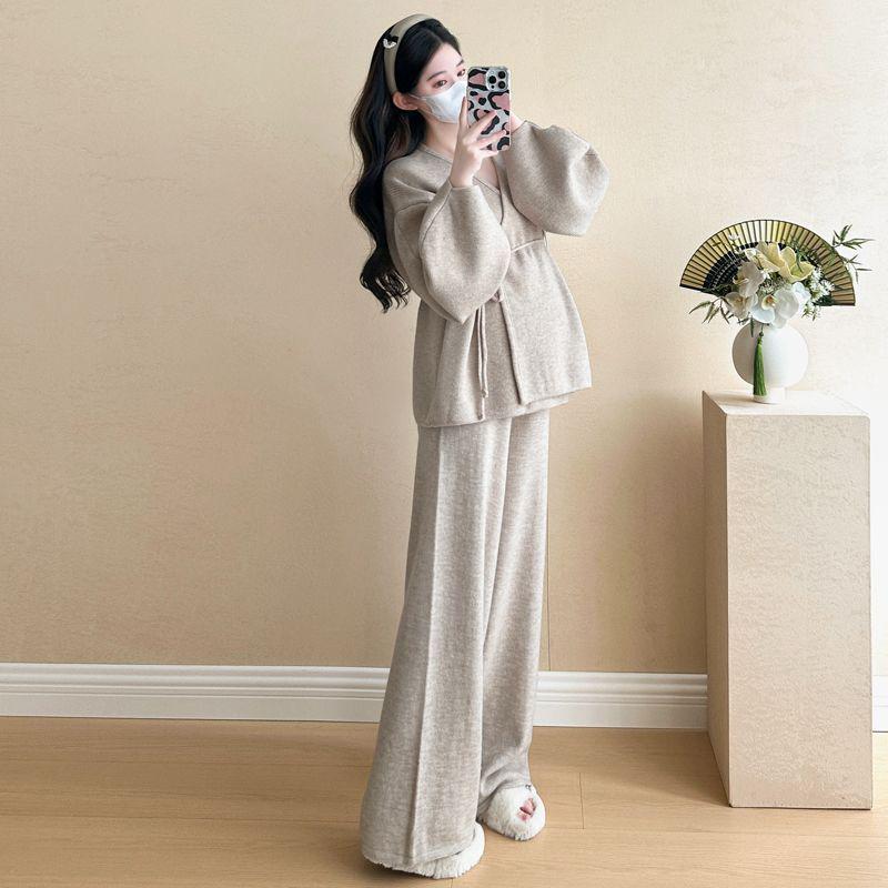 Вязаный комплект из двух предметов с V-образным вырезом, рукавами-фонариками и завязками, с брюками широкого кроя - Женский осенне-зимний корейский стиль