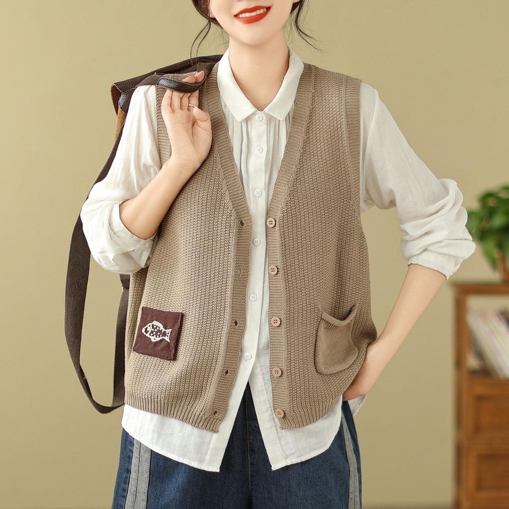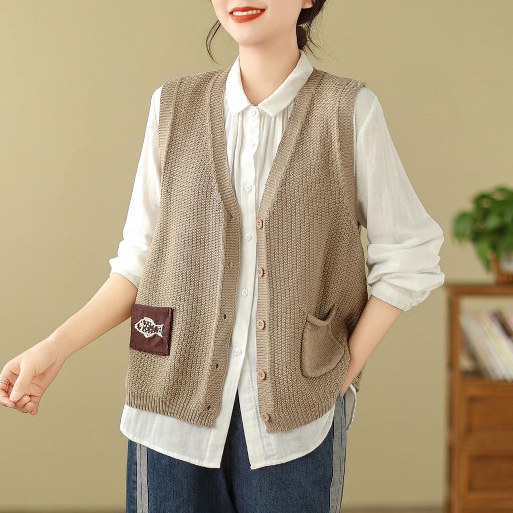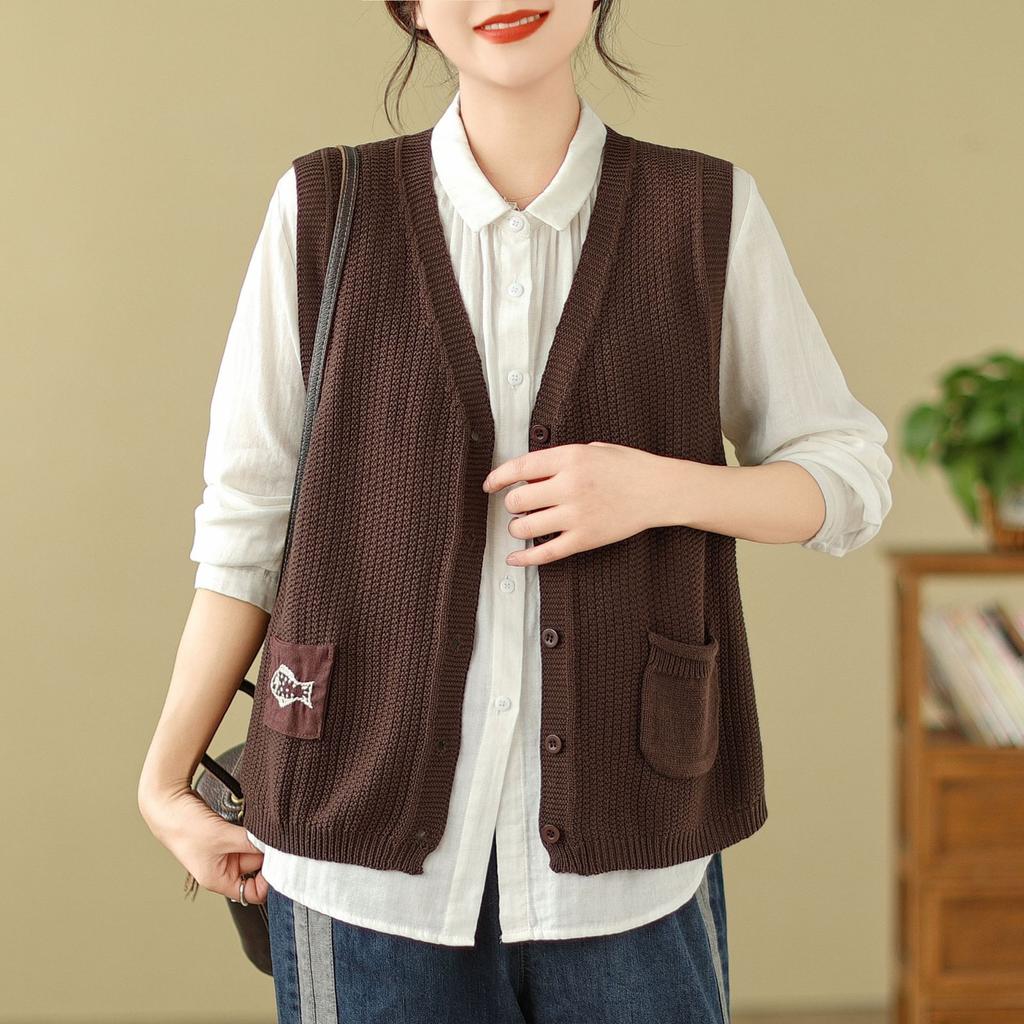 Женский вязаный жилет Свободный свитер без рукавов Вышитая повседневная одежда Джемпер Топы