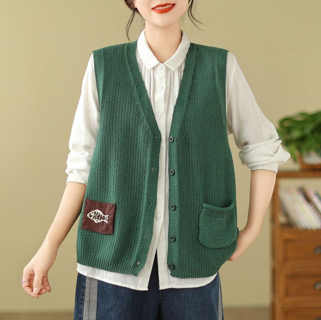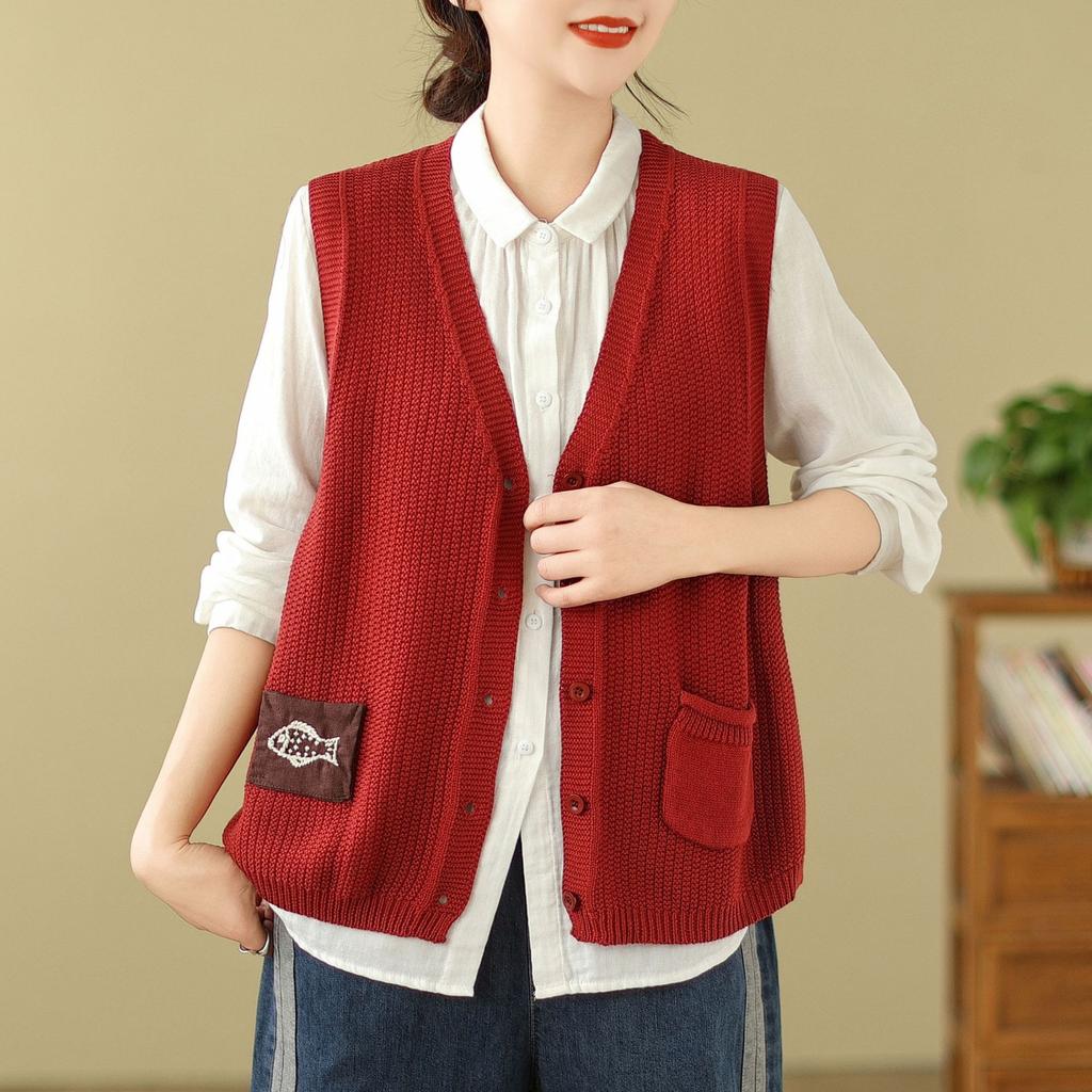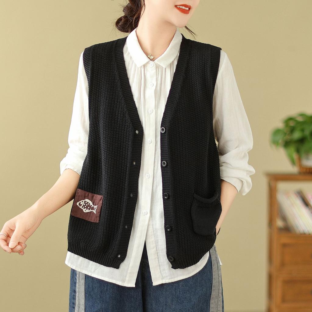 Женский вязаный жилет Свободный свитер без рукавов Вышитая повседневная одежда Джемпер Топы