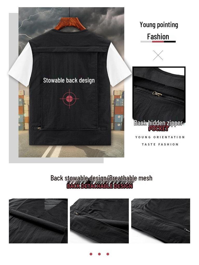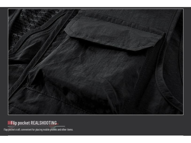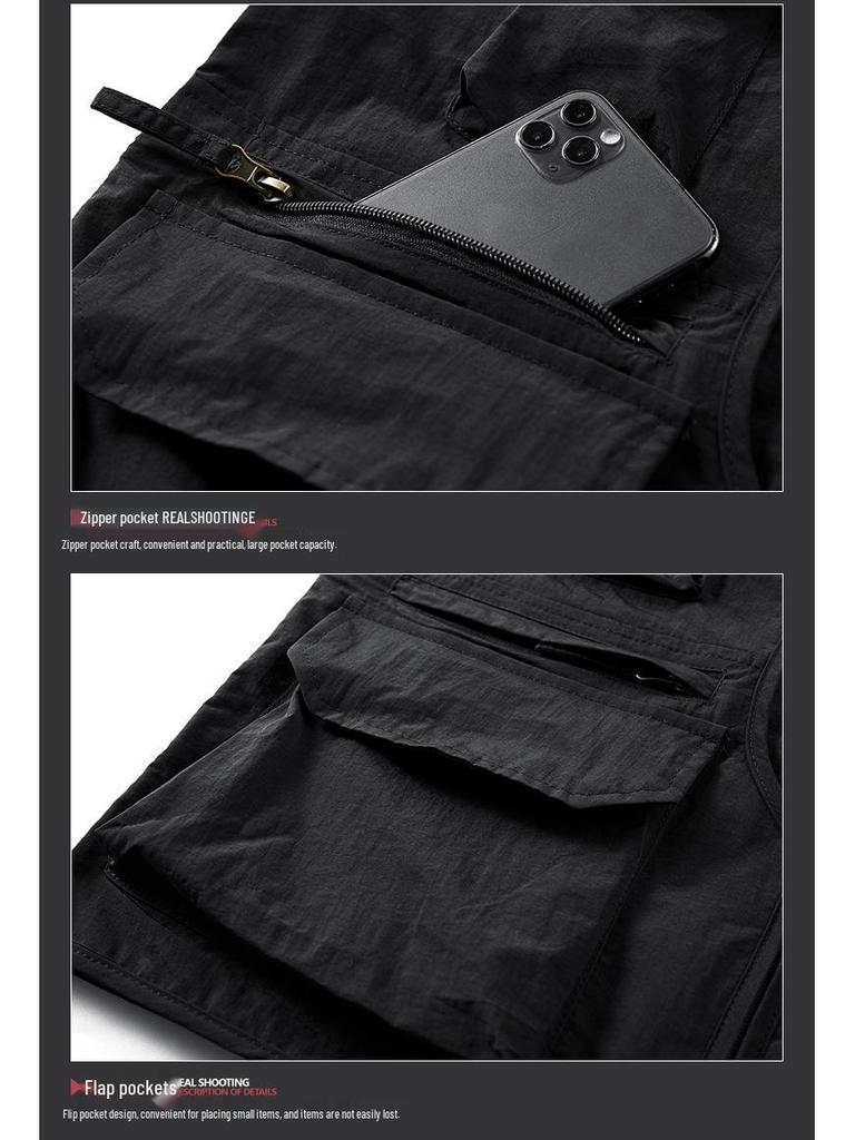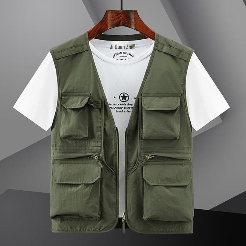Этот мужской жилет для рыбалки на открытом воздухе предлагает практичное и стильное решение для ваших приключений на природе. Разработанный со свободным кроем для комфорта, он имеет V-образный вырез и удобную застежку-молнию.. Тонкая верхняя одежда жилета делает его легким и дышащим, идеальным для занятий в теплую погоду.. Изготовлен из прочного нейлонового материала с однотонным рисунком, включает несколько карманов для хранения необходимых вещей под рукой в дороге.. Жилет также украшен принтом с логотипом, добавляющим индивидуальности вашей рыболовной экипировке.