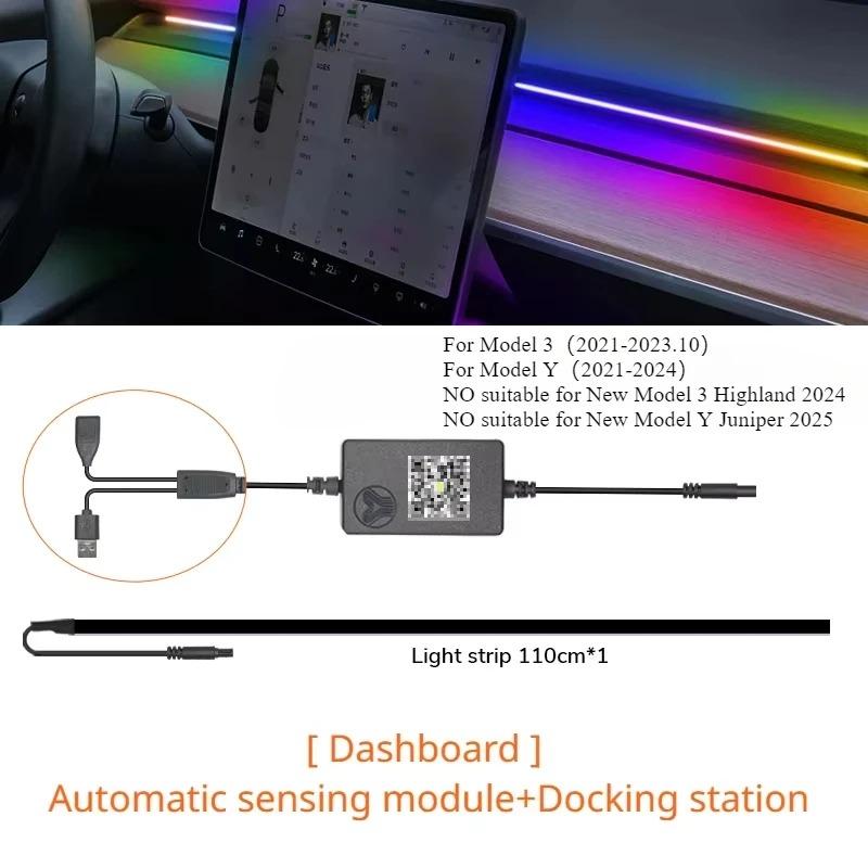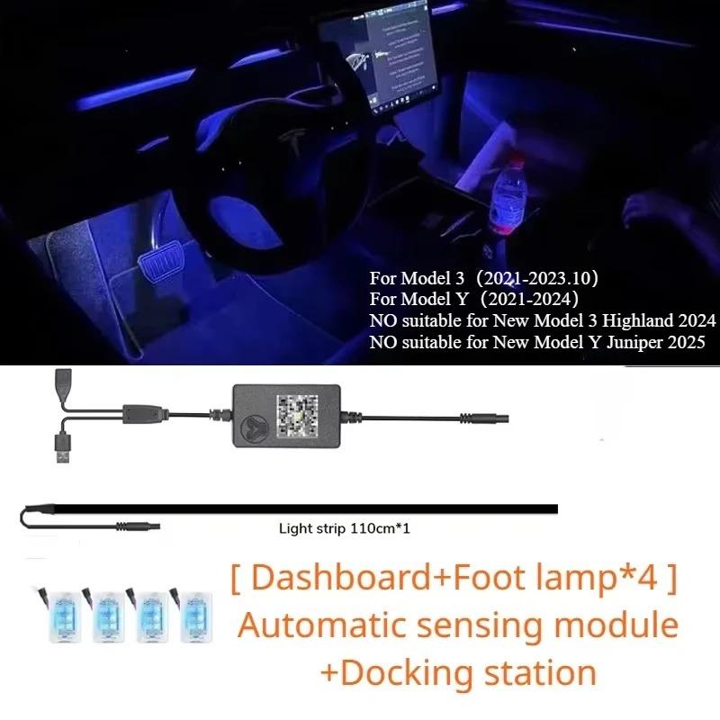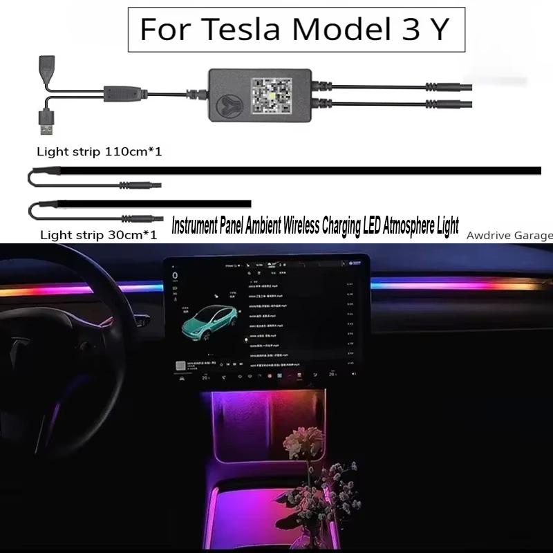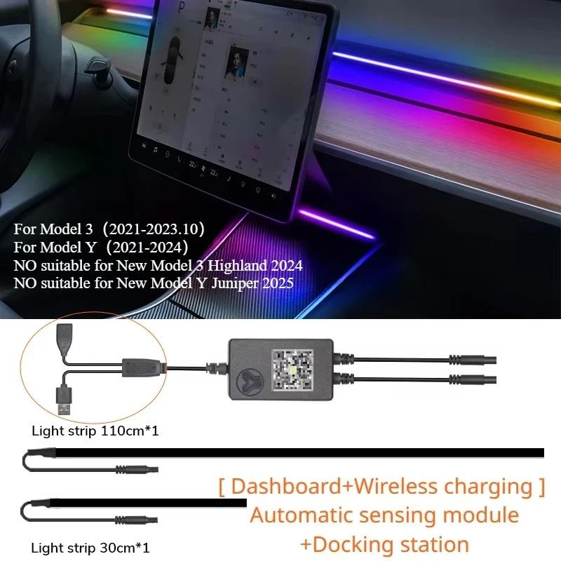 Для Tesla Model 3 Y Подсветка приборной панели, окружающая подсветка, беспроводная зарядка, светодиодная атмосферная подсветка, управление через приложение, светодиодные ленты, неоновая подсветка