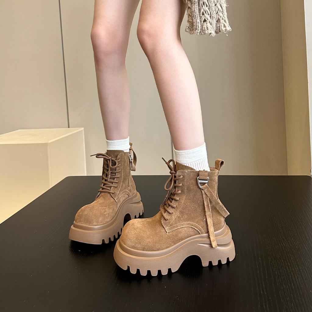 Ретро ботинки Мартин на толстой подошве с увеличением высоты для женской коллекции осень 2025, новые модные облегающие короткие ботинки на шнуровке цвета ревеня