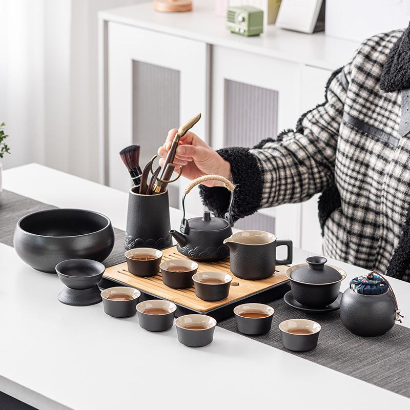 Высококлассный набор для чая Кунг-фу из черной керамики, простой керамический поднос для чая для домашней гостиной, современный большой набор в подарочной коробке класса люкс