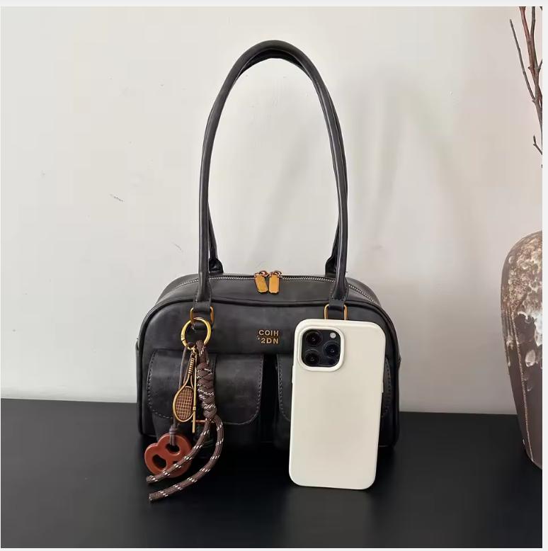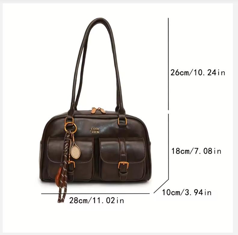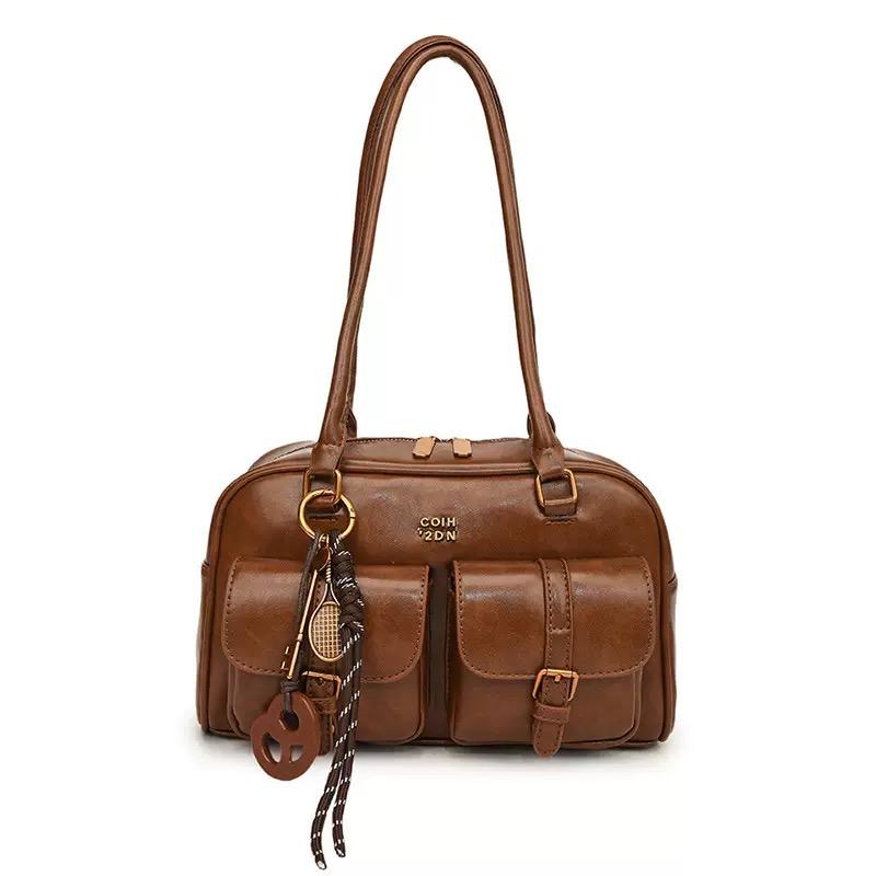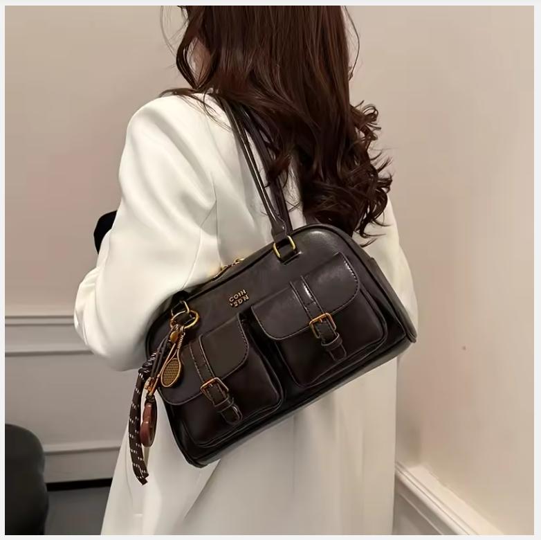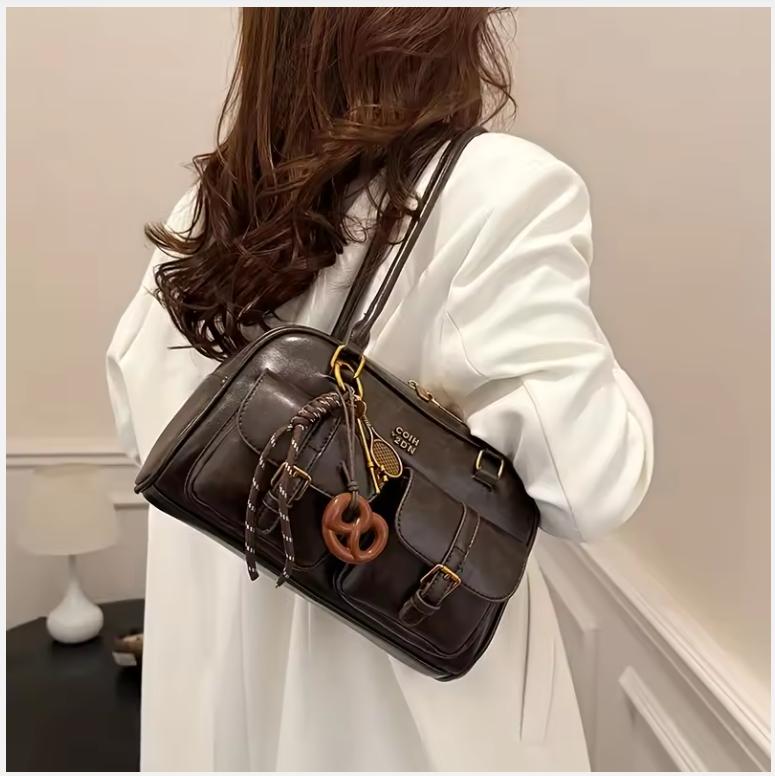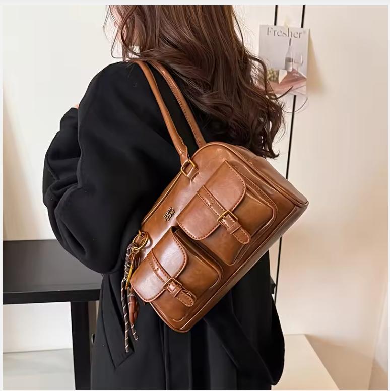 Женская ретро однотонная плечевая сумка из искусственной кожи с несколькими карманами большой вместимости поставляется со съемным аксессуаром-шармом