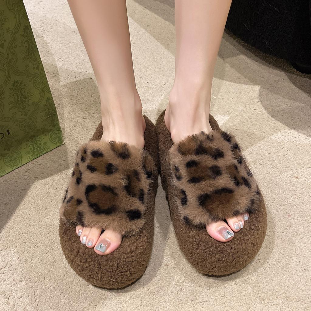2025 осень новые корейская версия леопардовый принт толстая подошва пушистые тапочки женские носят с открытым носком плюшевые домашние хлопковые тапочки маленький размер