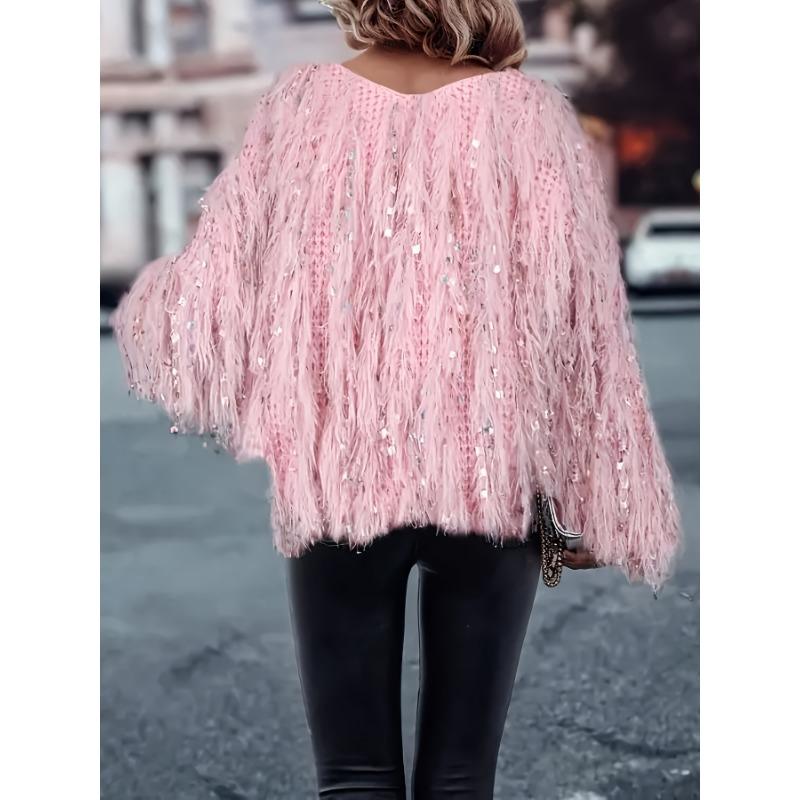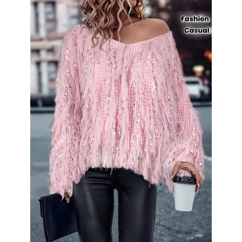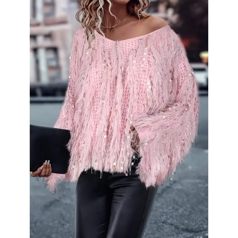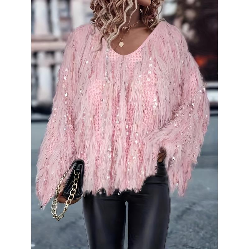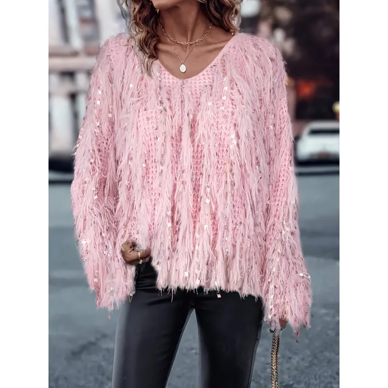 Женский свитер с длинным рукавом, V-образным вырезом и кисточками, модный повседневный пуловер