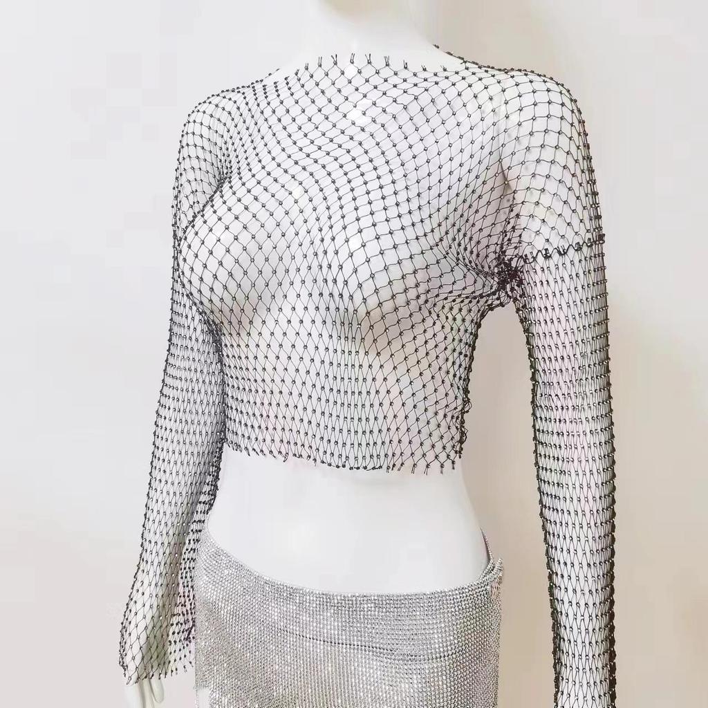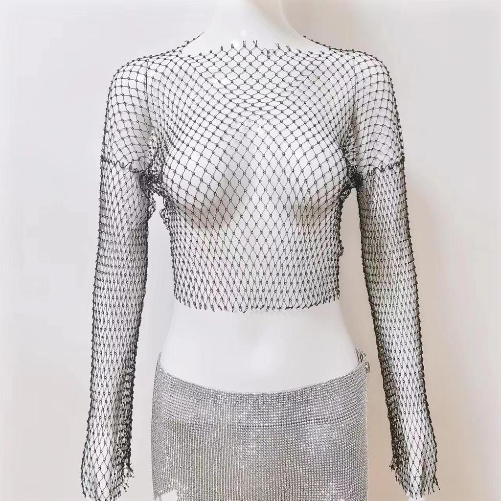 Европейская и американская сетчатая футболка с длинным рукавом и стразами - Сексуальный топ для горячей девушки
