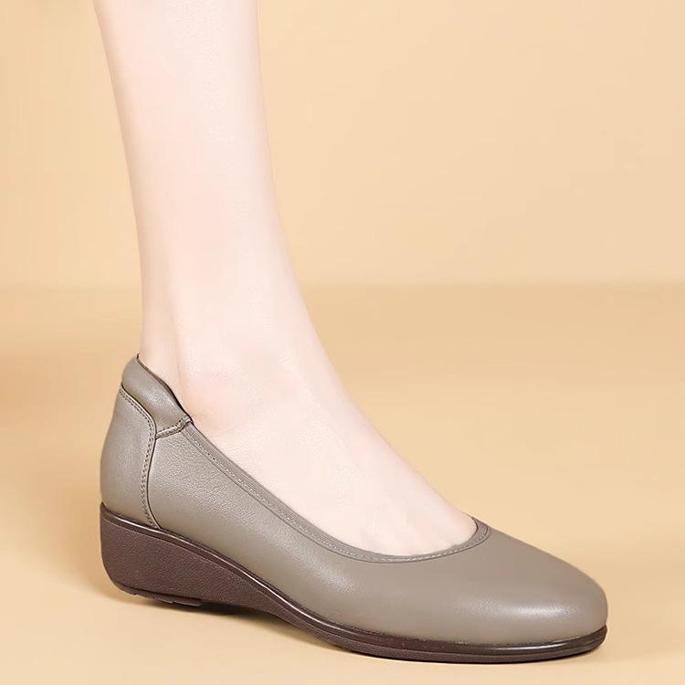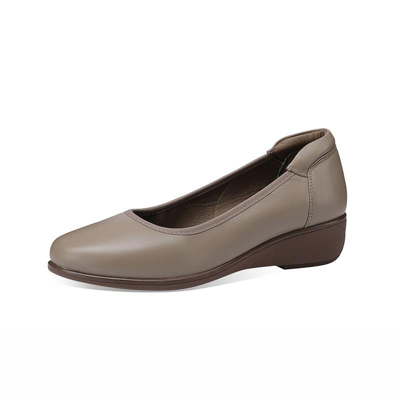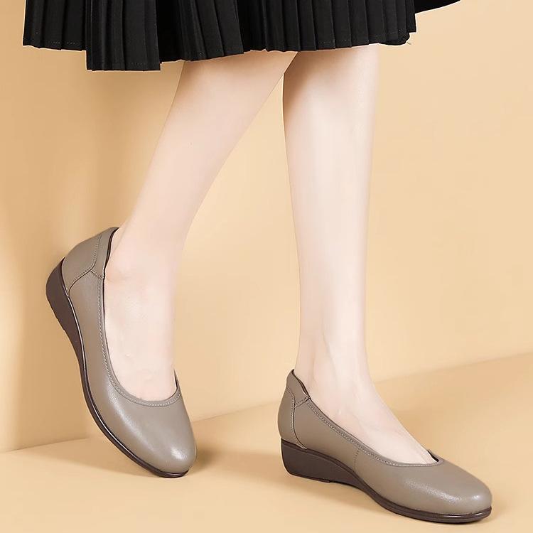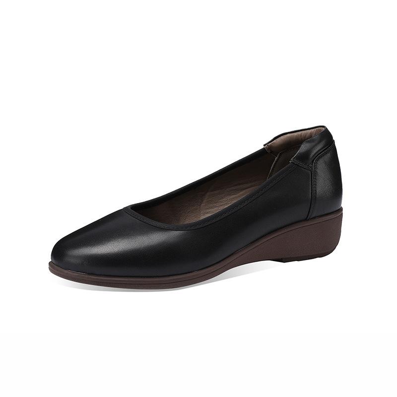 Туфли на танкетке женские 2025 осень новые с круглым носком удобная мягкая подошва мягкий верх женские туфли с мелким вырезом туфли бабушки кожаные туфли