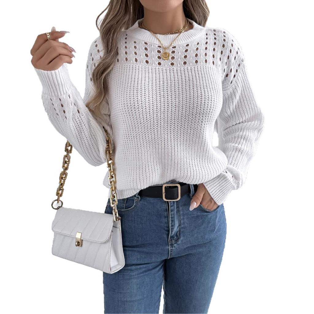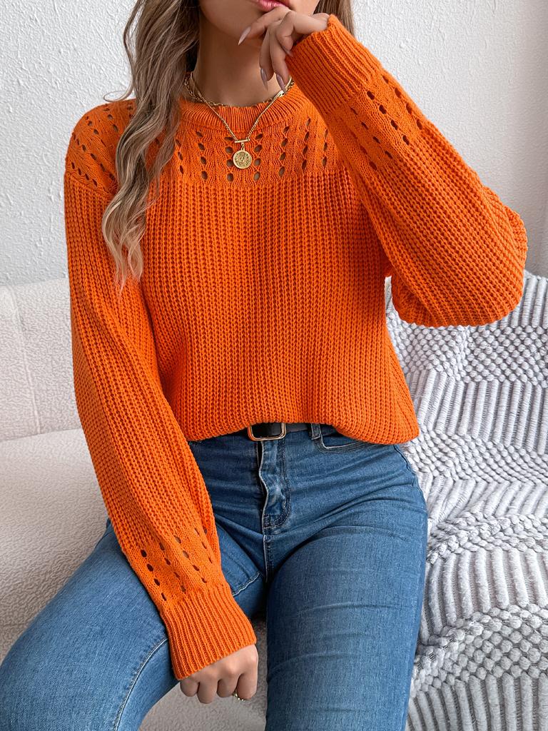 Повседневный однотонный пуловер с длинными рукавами и ажурным узором в виде фонаря