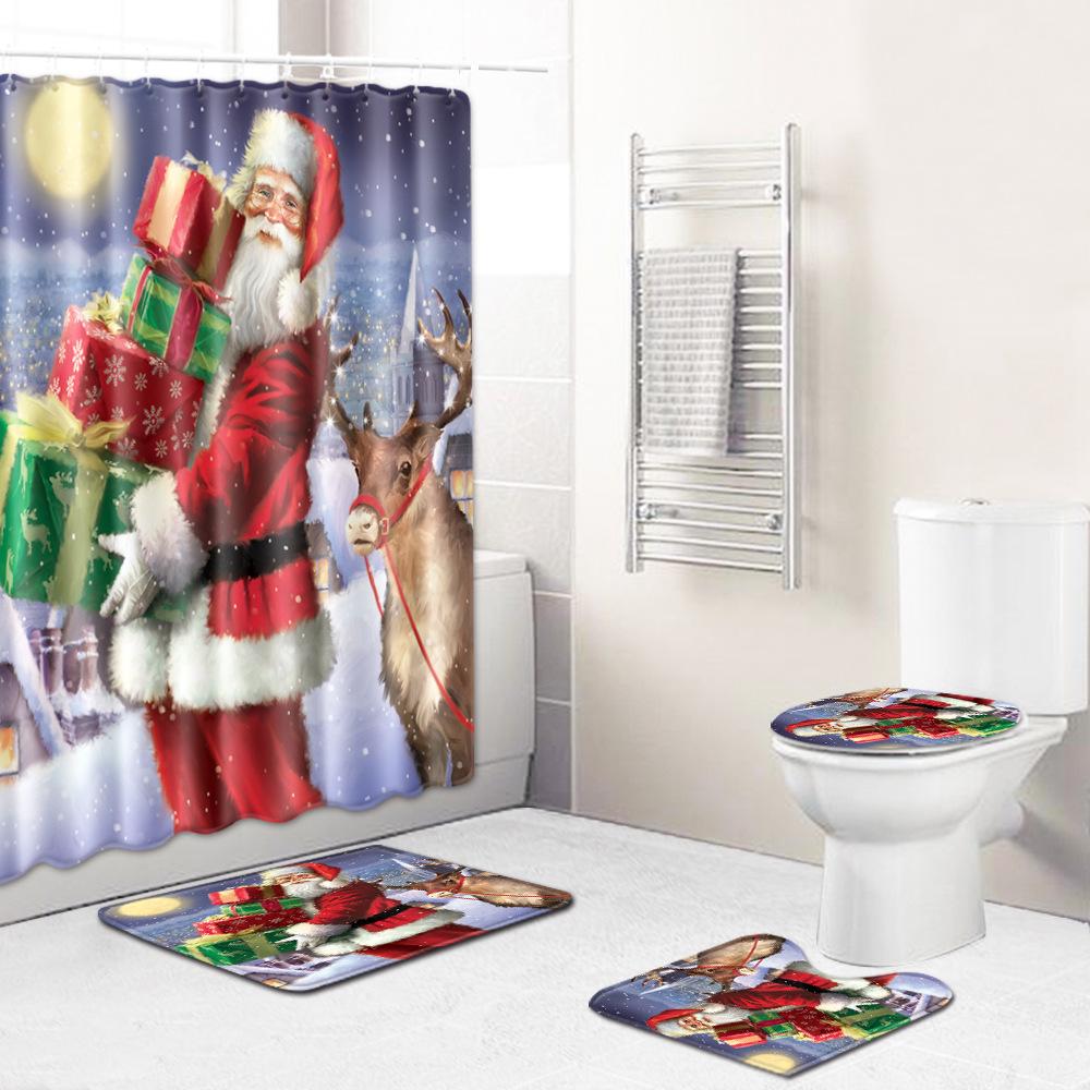Christmas Shower Curtain Floor Mat Combination Four-Piece Set Bathroom Toilet Carpet Shower Room Mat Foot Mat