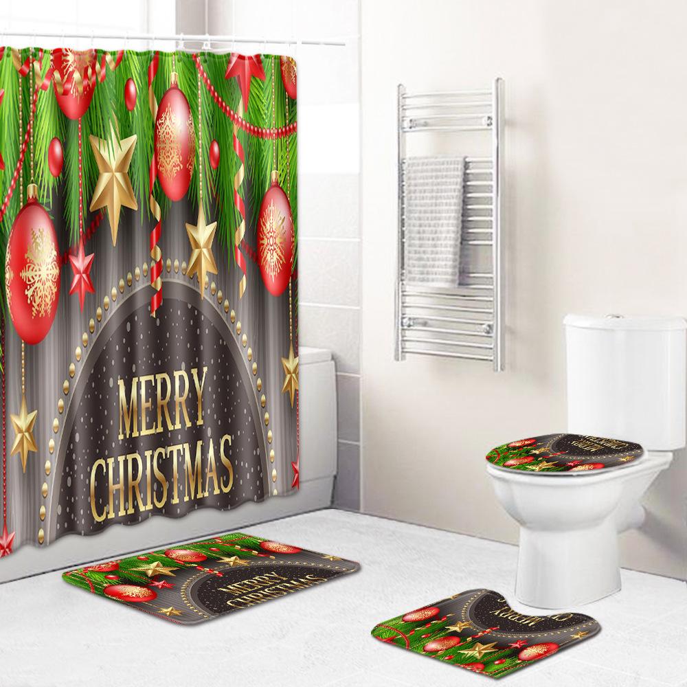 Christmas Shower Curtain Floor Mat Combination Four-Piece Set Bathroom Toilet Carpet Shower Room Mat Foot Mat