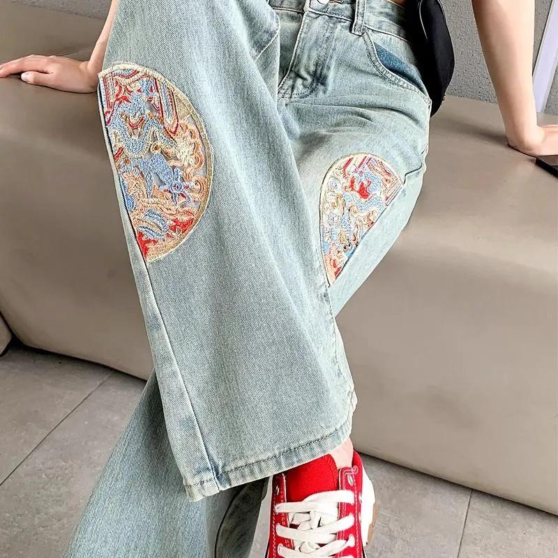 Women's 2025 Spring/Autumn High-Waist Embroidered Wide-Leg Jeans - National Style