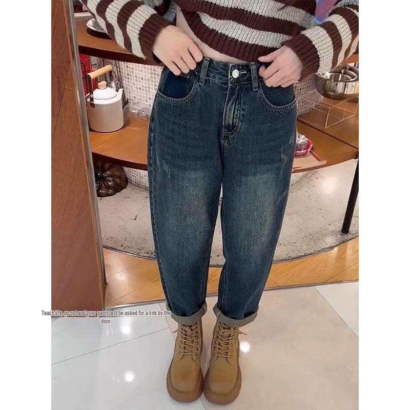 Ретро джинсы гаремы больших размеров с флисовой подкладкой для женщин - Высокая посадка, свободный крой, Зима 2025 — купить товар онлайн с бесплатной доставкой до всему миру!