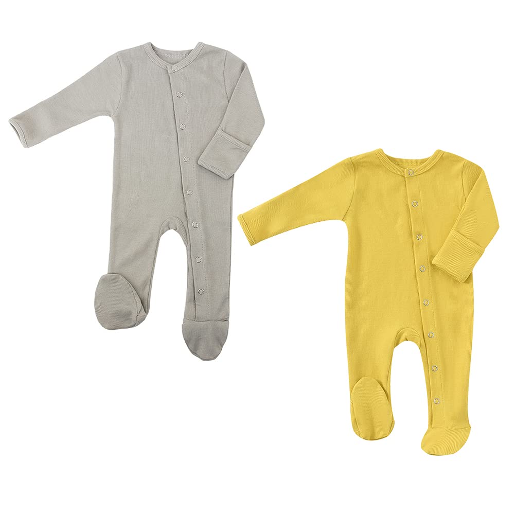 KISBINI Baby Long Sleeve with Footed Newborn Front Baby Ages Months Romper, Coverall, Cotton, Foots, Underwear, Opening, Gift, Gray/Yellow, 3-6