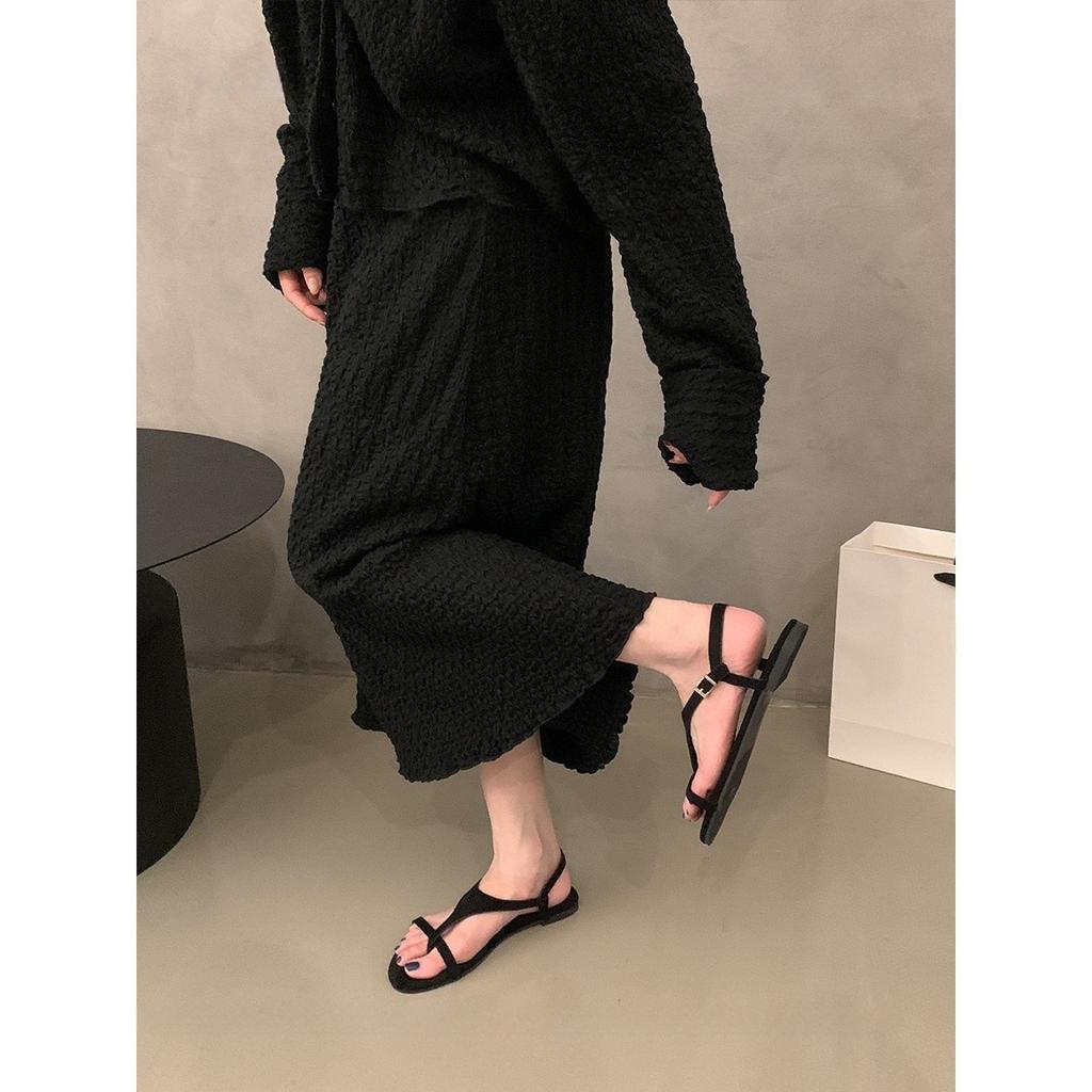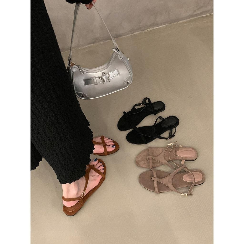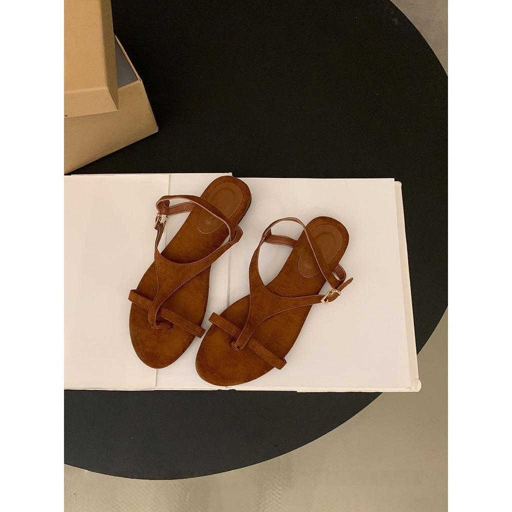 2025 лето новые ретро нишевые сандалии туфельки феи мягкая плоская подошва с юбкой тонкий ремешок коричневые римские сандалии