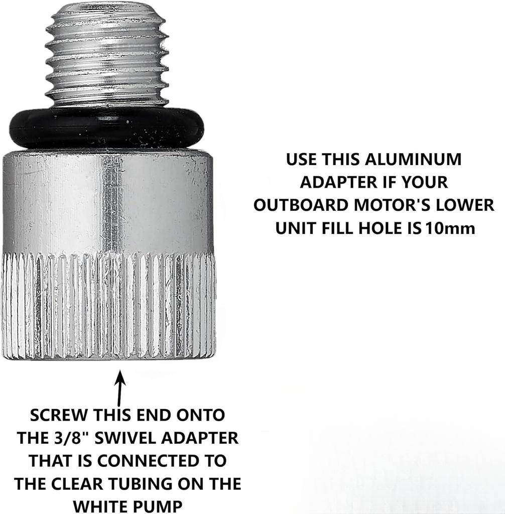 Масляный насос для редуктора лодочного мотора для стандартных литровых бутылок. Включает поворотный штуцер 3/8 дюйма и адаптеры 8 мм, 10 мм. Подходит для большинства подвесных лодочных моторов.