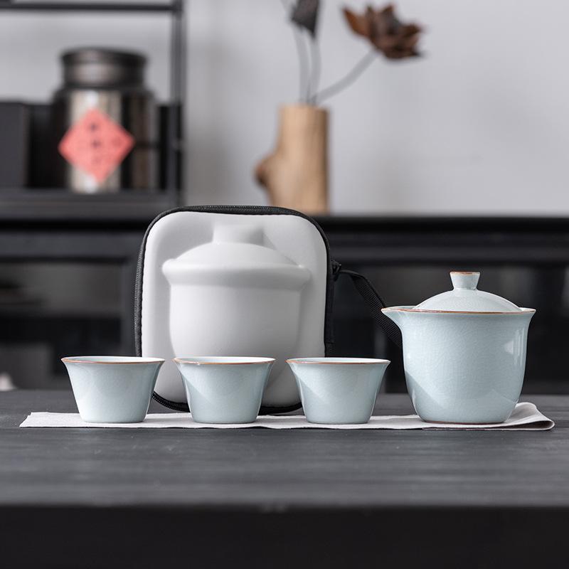 Легкая роскошь Жу窑 открытый дорожный чайный набор для путешествий, портативный для улицы, один чайник, три чашки, высококлассный, деловой, практичный