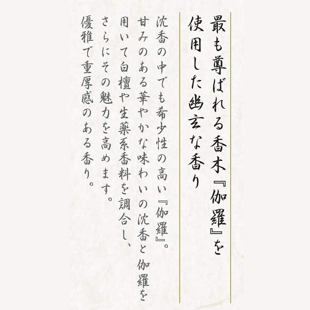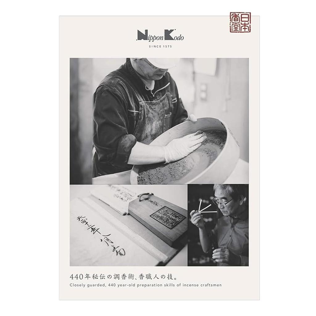 Благовония также можно найти в местах, где люди ищут возбуждения и покоя. Благовония — это современная высшая духовная культура и культура обогащения повседневной жизни. Восходящая к 4000 лет назад, из Древней Индии, культура ароматов, которая развивалась уникально на Востоке и Западе, воссоединилась в Японии, смешиваясь и продолжая расти с новыми творениями.