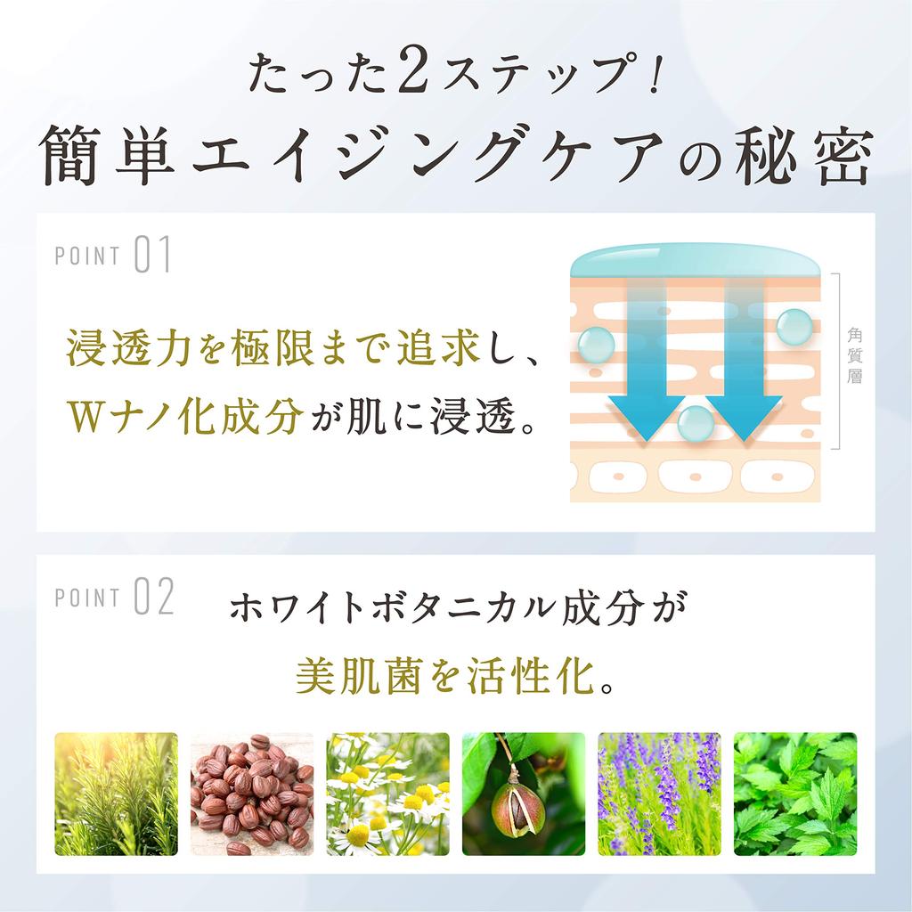 Этот набор для ухода за кожей успокаивает не только вашу кожу, но и ваш разум. Двойные наноразмерные ингредиенты с максимальной проникающей способностью (※) мгновенно проникают в кожу, и 23 вида белых растительных ингредиентов активируют кожные бактерии, улучшающие красоту, и усиливают естественную увлажняющую способность кожи. Уход за стареющими людьми осуществляется всего за два шага: лосьон и эмульсия. Содержит более 85% ингредиентов натурального происхождения, нежно воздействует на кожу и способствует упругости и сиянию кожи.. (※) Он проникает до самого рогового слоя.