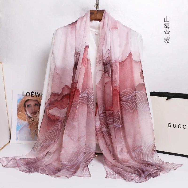 Весна Лето 100% Шелк Шарф Шаль Хиджаб Обертывание Женский Длинный Тонкий Цветочный Пляжные Шарфы 180*110см