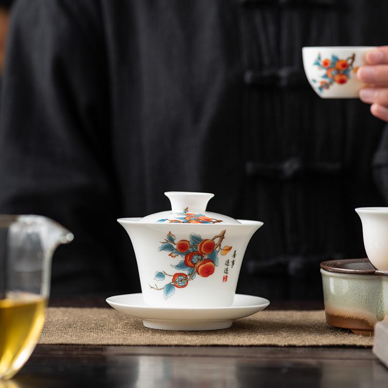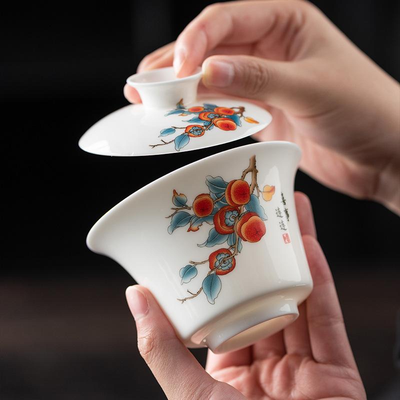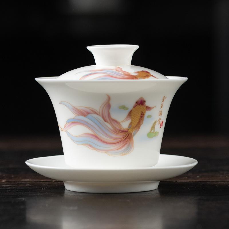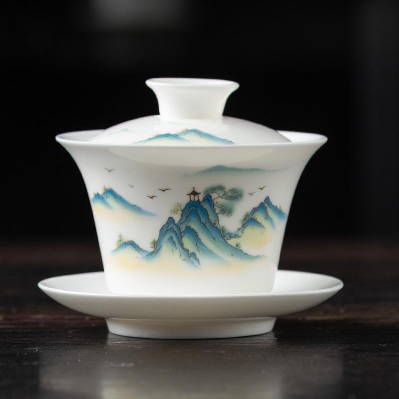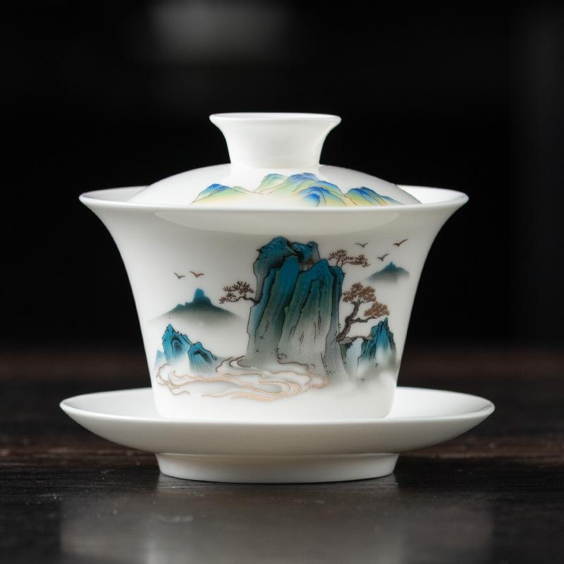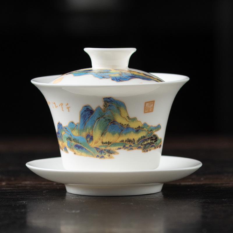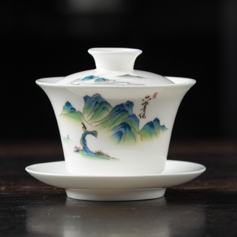 Легкая роскошь имитация ручной росписи сальный нефрит фарфор Саньцай чаша с крышкой чайный набор для кунг-фу одиночная чайная чашка чайная пиала чистый ручной работы бутик