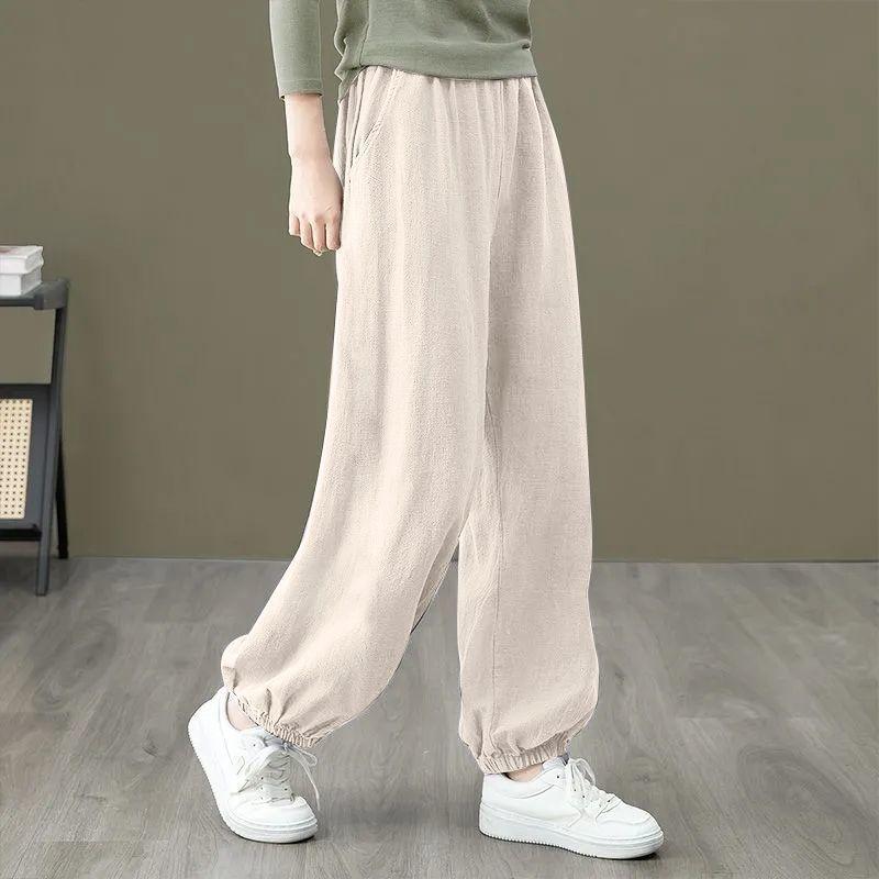 Женские модные повседневные брюки Весна Лето Свободного кроя Эластичная талия Хлопок Лен Зауженные брюки до щиколотки